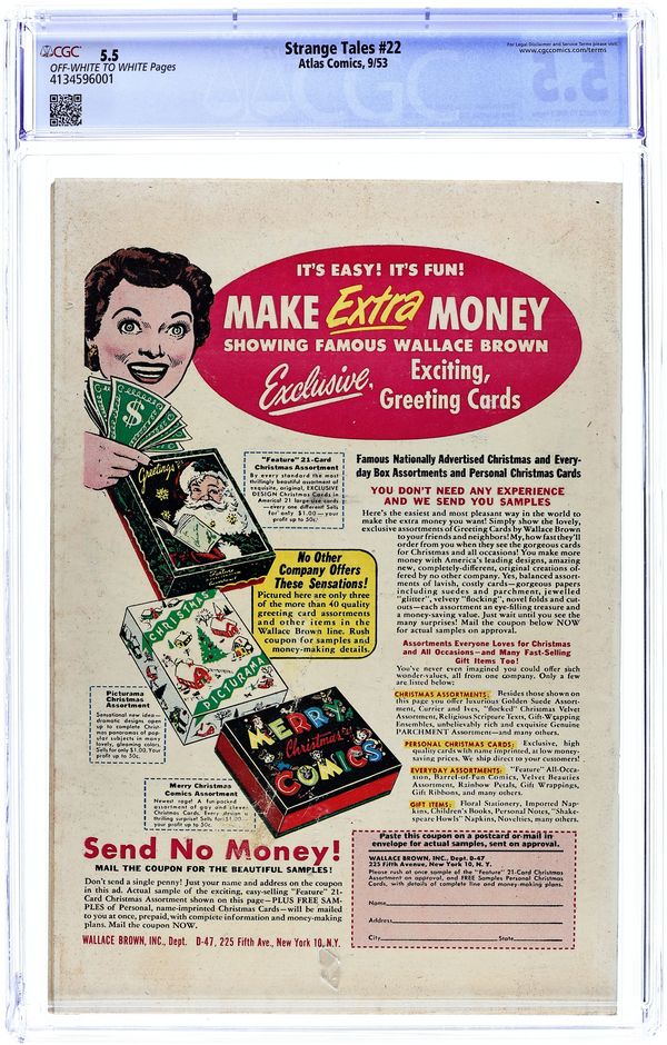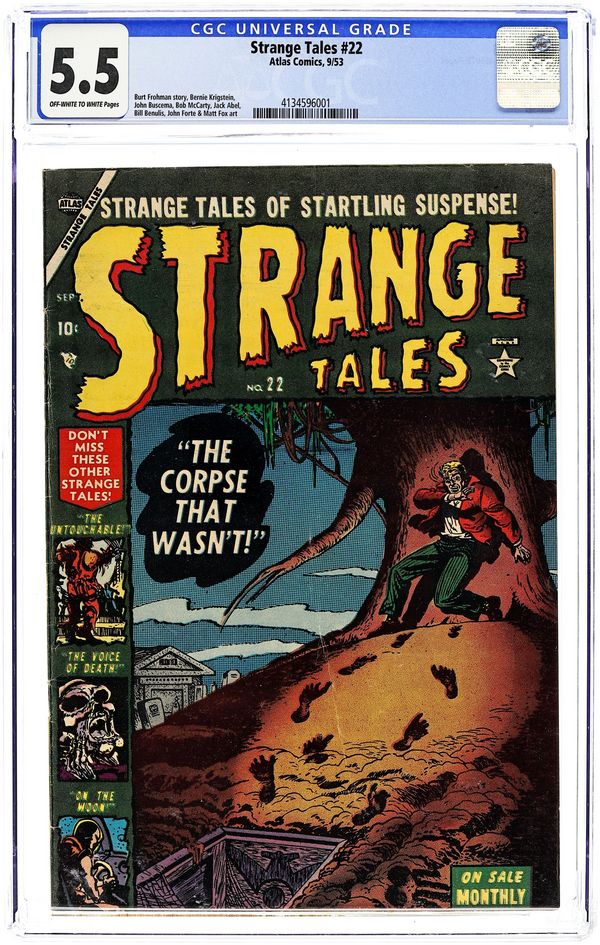 Cover art by Sol Brodsky. The Untouchable!, art by Bernie Krigstein; When a starving white man, who considers himself one of the highborn caste, takes food from an untouchable the natives now consider him to be a part of that caste. The Easter Eggs text story. What Happened On the Moon?, pencils by Bill Benulis, inks by Jack Abel; A scientist builds a robot that can survive the voyage to the moon. The Voice of Death, art by Bob McCarty. Too Good To Be True!, pencils by John Forte, inks by Matt Fox; The Devil makes a gambler have good luck so he wins all his bets. The Corpse That Wasn't, art by John Buscema. 36 pgs. $0.10. Cover price $0.10.