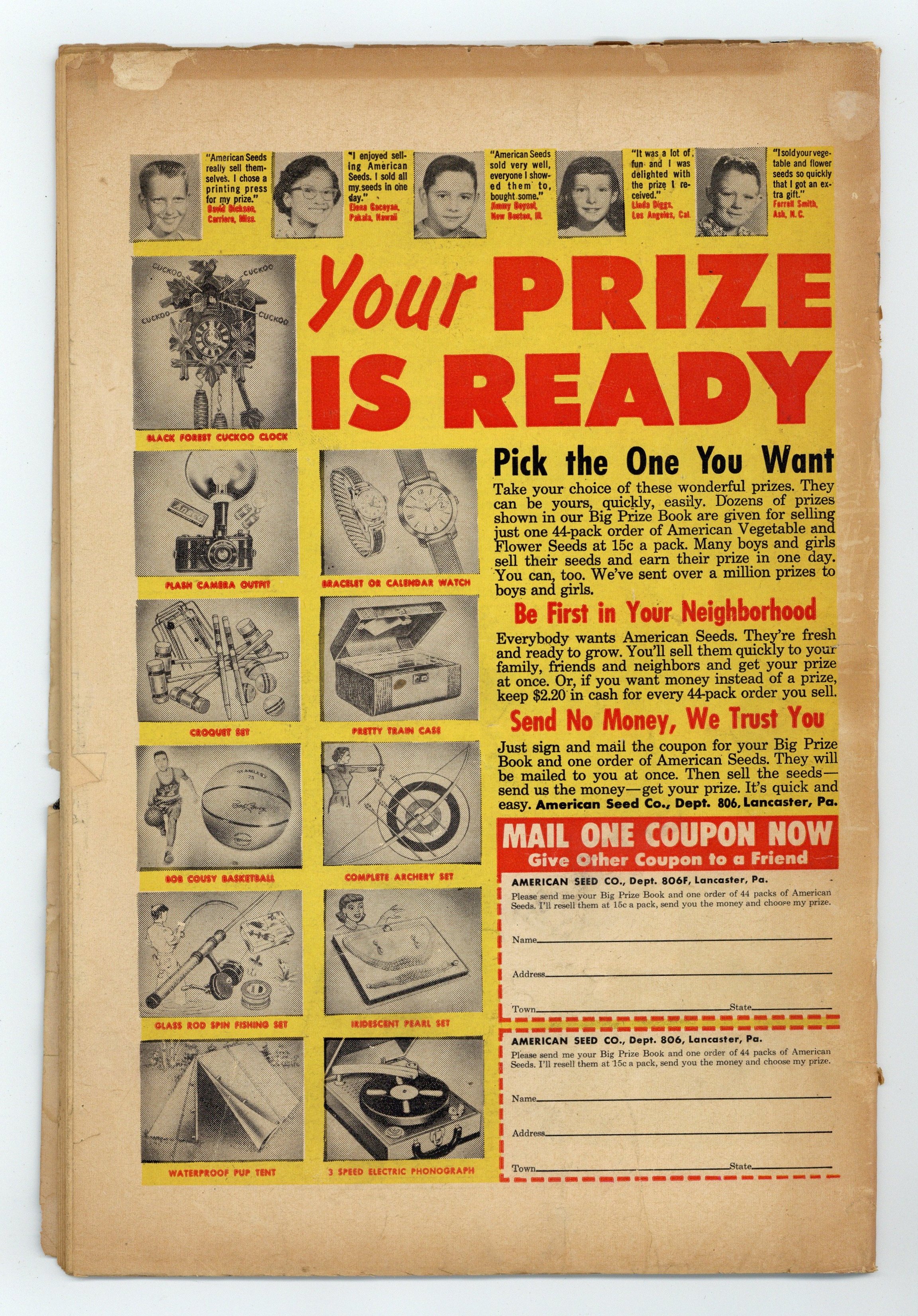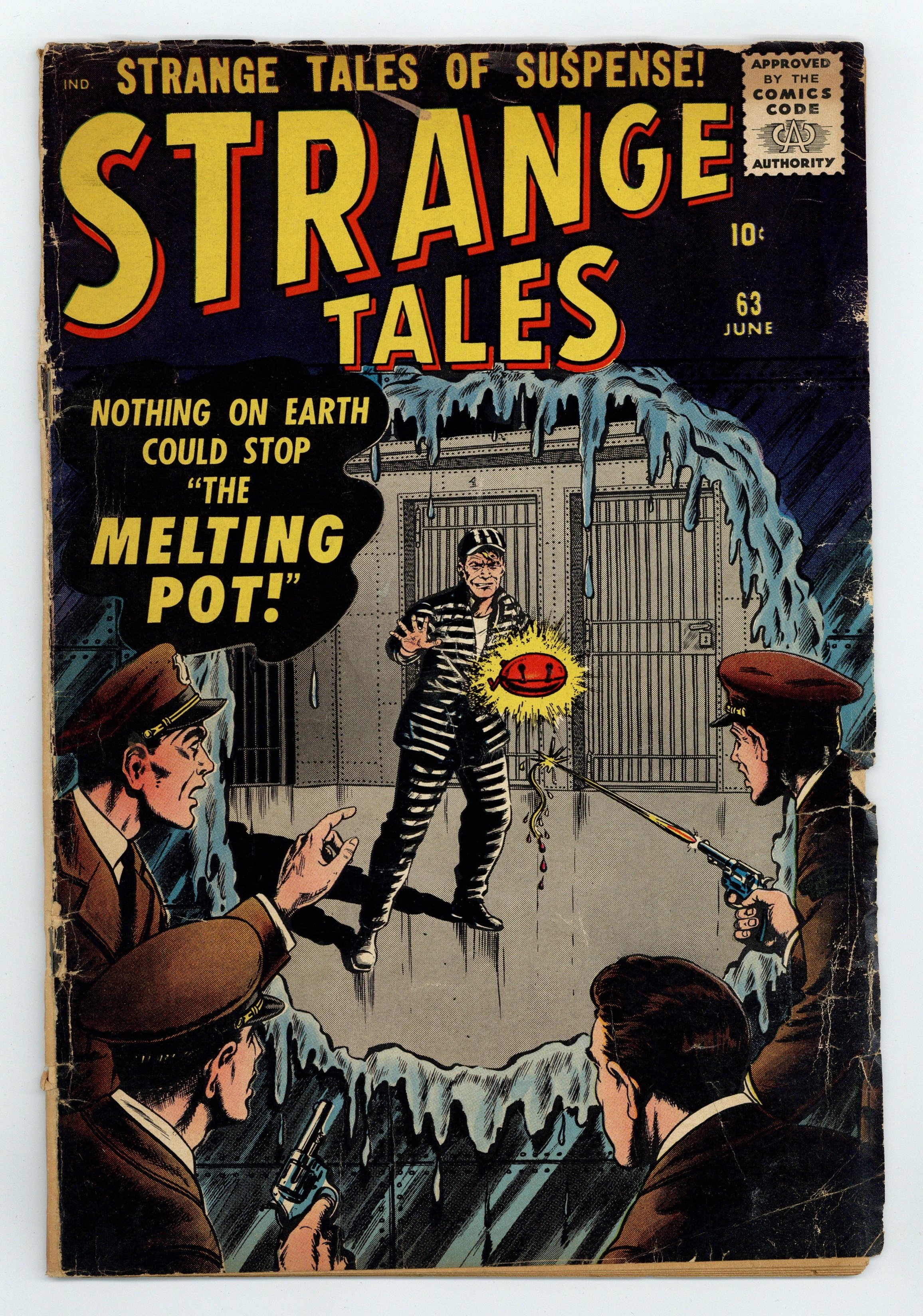 Cover art by Bill Everett. "He Never Came Out!", art by Alphonso Greene; A wax museum owner claims that his statues are criminals petrified by the head of Medusa; When a thief ignores this warning and tries to rob him, the museum gains a new statue. "Uncork It...If You Dare!", art by Howard O'Donnell; A meek man is left a bottle of gas that changes personalities; Instead of using it to become more daring, he uses it on UN diplomats. "The Drowning Man!", art by Christopher Rule; A cafe owner comes across Atlanteans exiling some of their criminals; The guards save him from drowning and he is offered citizenship. "Flight Number Thirteen!", art by Ruben Moreira; Two criminals hijack an airplane full of strangely emotionless passengers; The airplane is piloted remotely into the parallel world that the passengers came from, where the air will drain the pilots' emotions. "The Melting Pot," art by John Forte; A convict creates a melting pot to free himself from jail to steal gold, but the pot melts the gold and leaves him trapped in molten metal. "The Free Ride" text story. "Too Good to Be True!", art by Don Perlin; A young boy imagines that he has a rich uncle who suddenly appears, but when he begins to doubt, the uncle fades away. 36 pgs., full color. Cover price $0.10.