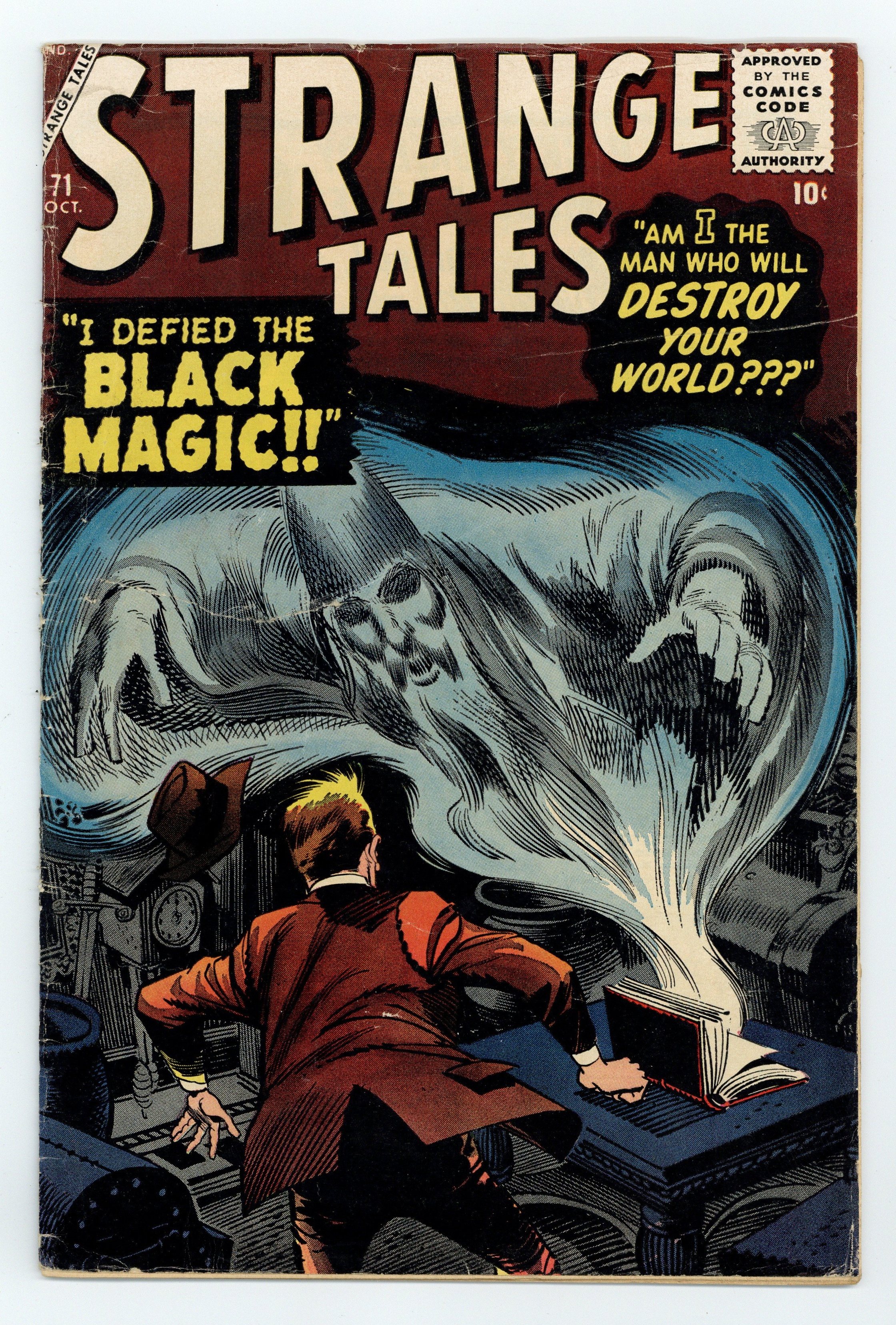 Cover art by Jack Davis. "I Dared to Defy Merlin's...Black Magic!", art by Steve Ditko; An American businessman scoffs at a shopowner's claim that one of his books was Merlin's diary, until a terrifying vision of Merlin turns his hair white. "The Disappearance" text story. "I Am the Man Who Will...Destroy Your World!", art by Don Heck; An alien emperor of an immortal race comes to Earth disguised as a human to decide whether or not to order an invasion; He is impressed with the humans' decency and falls in love with a human girl. "When the Saucer Strikes!", art by Paul Reinman; A airline pilot is nearly hit by a flying saucer and must bank suddenly to avoid it; The passengers were mostly asleep, and the one who was awake says that he saw nothing...because he's really a Martian tourist and the saucer came to pick him up. "I Fought the Man Who Couldn't Be Killed!", art by Sol Brodsky; A criminal escapes from prison after 10 years and robs a warehouse; He is found by a police officer with superhuman powers, and is surprised to learn that the police now only recruit robots. "I Am the Man Without a Face!", art by Joe Sinnott; A bigot rounds up some thugs to don black hoods and drive some harmless gypsies out of town; One of the gypsies curses him, and he is never able to remove his hood for the rest of his life. 36 pgs., full color. Cover price $0.10.