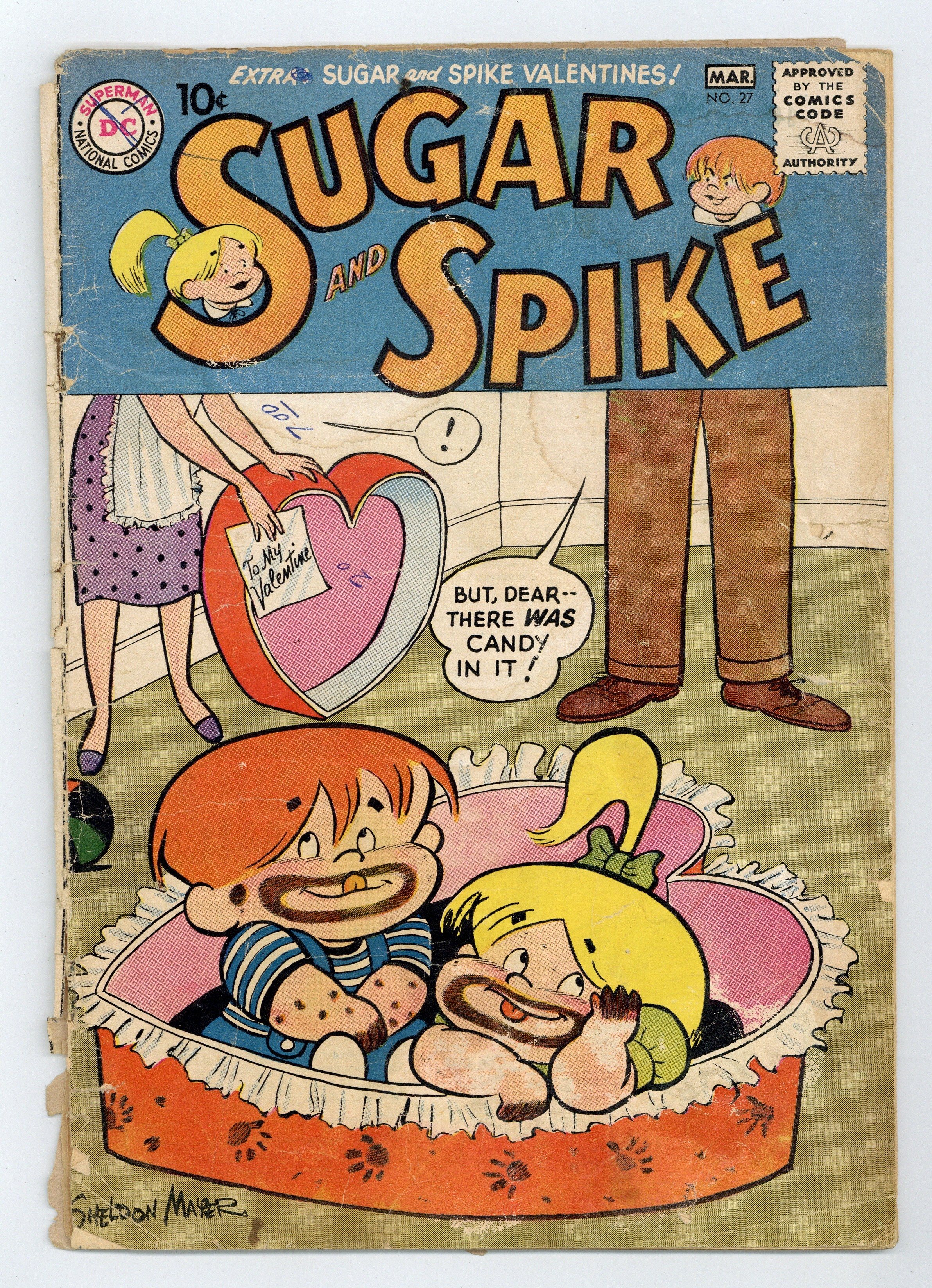Cover art by Sheldon Mayer. Uncle Charley Tackles the Baby-Talk Mystery; Charley sets up a tape recorder to record Sugar while Arthur pays a visit. Little Giants; Sugar's mom keeps Sugar busy with a dollhouse where she acts out her frustrations with the adults in her life. The Strange Stranger; Sugar and Spike meet a new kid in the neighborhood, but the question is: Is the kid a boy or a girl? Scripts and art by Sheldon Mayer. Valentine Mix-Up starring Sugar & Spike. Superman on Television ad. Pint Size Valentines by Mayer. It's Fun to Help Others! public service announcement starring Superboy, script by Jack Schiff, pencils by Curt Swan, inks by Stan Kaye. 36 Pages, Full Color. Cover price $0.10.