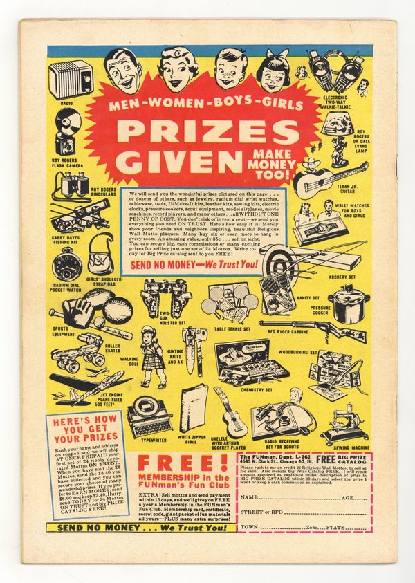 $110.00Cover by Wally Wood. Stories by Carl Wessler. Art by Al Williamson, Angelo Torres, Marie Severin, Bernie Krigstein, Graham Ingels, and Wally Wood. One of EC Comics' late New Direction titles, a response to the new Comics Code, featuring historical adventure. A Roman gladiator rises and falls on the word of the Emperor's smitten wife, with art by Al Williamson and Angelo Torres. An overconfident general finds the Haitian natives have outmaneuvered him, illustrated by Bernie Krigstein. A British warrior claims to be the returned King Arthur, but his rule is anything but kingly, in a Wally Wood story. The Arena; The Guardians of Empire; Strategy; Revolution; The Return of King Arthur. 36 pages, Full Color. Cover price $0.10.
