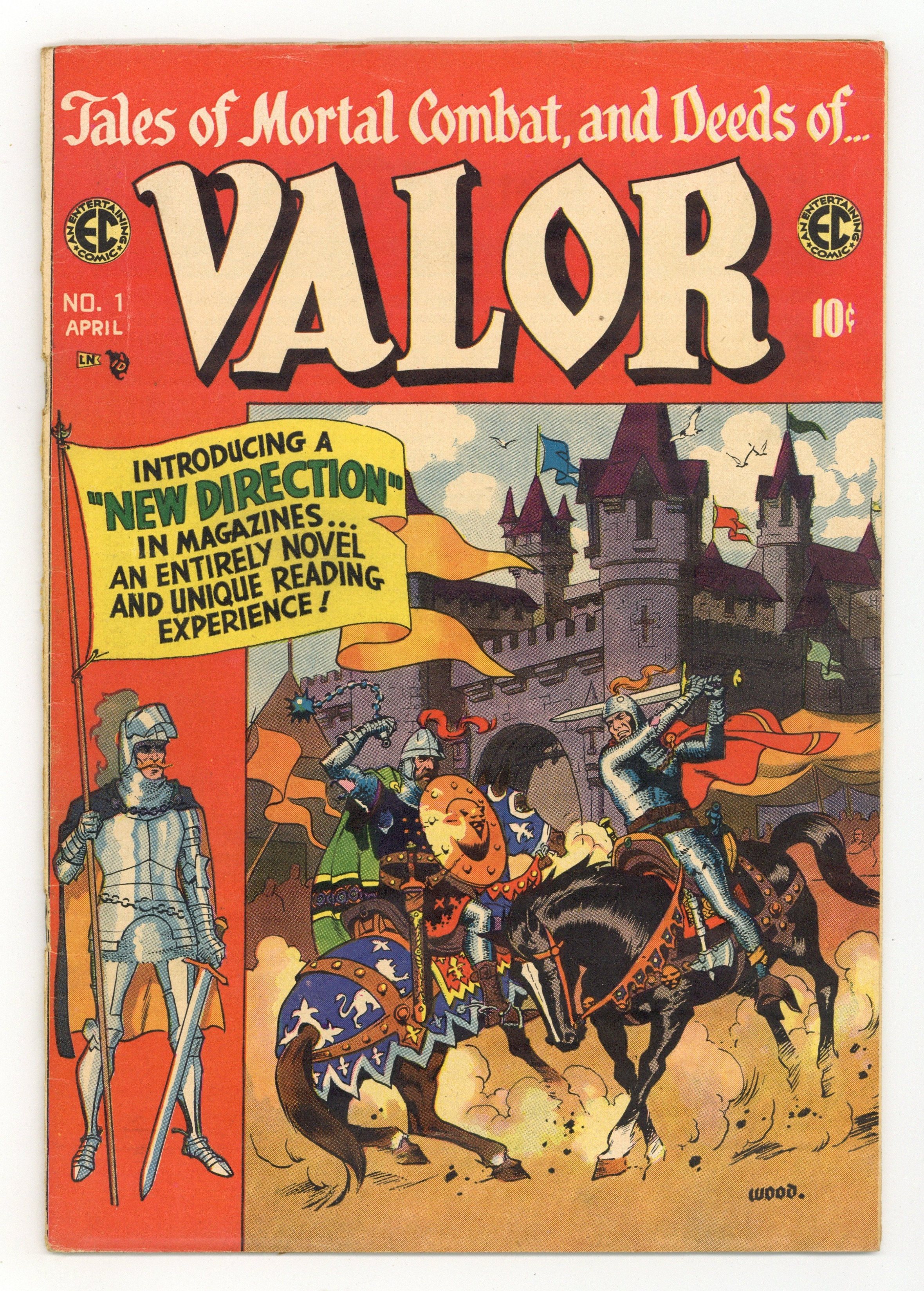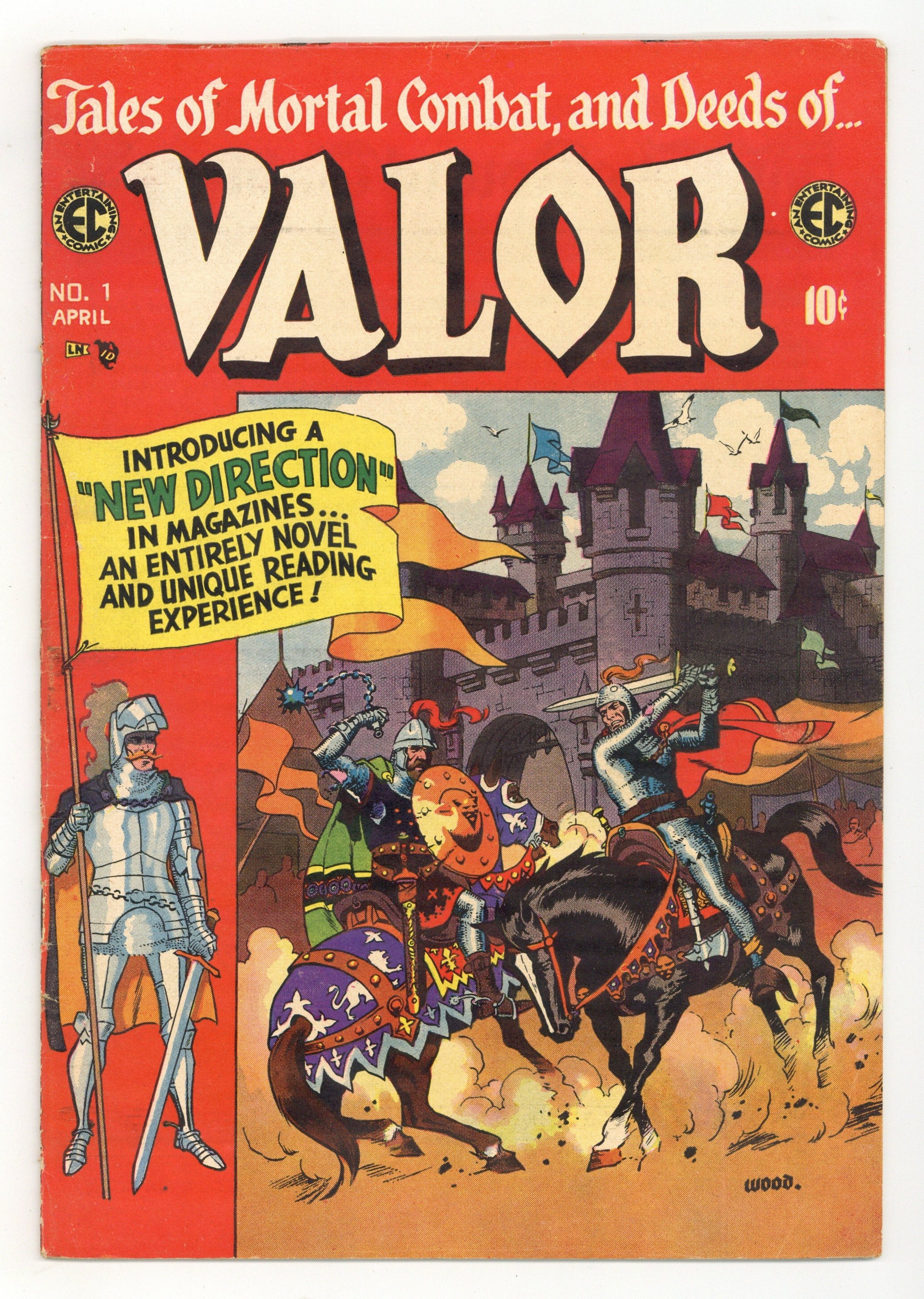 Cover by Wally Wood. Stories by Carl Wessler. Art by Al Williamson, Angelo Torres, Marie Severin, Bernie Krigstein, Graham Ingels, and Wally Wood. One of EC Comics' late New Direction titles, a response to the new Comics Code, featuring historical adventure. A Roman gladiator rises and falls on the word of the Emperor's smitten wife, with art by Al Williamson and Angelo Torres. An overconfident general finds the Haitian natives have outmaneuvered him, illustrated by Bernie Krigstein. A British warrior claims to be the returned King Arthur, but his rule is anything but kingly, in a Wally Wood story. The Arena; The Guardians of Empire; Strategy; Revolution; The Return of King Arthur. 36 pages, Full Color. Cover price $0.10.