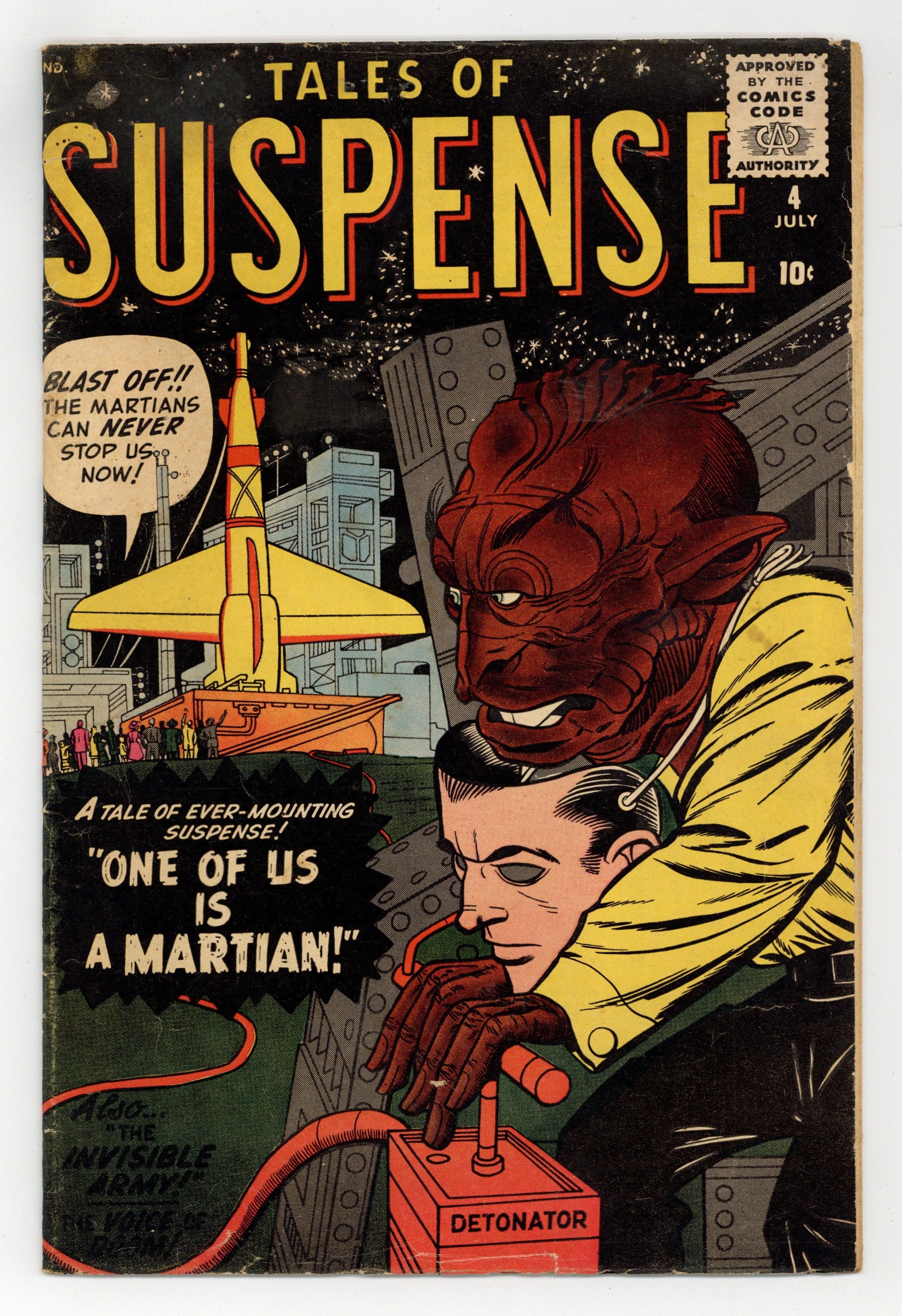 Cover pencils by Jack Kirby, inks by Christopher Rule. "The Invisible Army," art by Joe Sinnott; A scientist is forced to work for a dictator but, instead of creating an invisibility ray as ordered, creates a teleportation ray that banishes his top officers and allows a revolution. "Snowstorm" text story. "One of Our Spacemen Is Missing!", pencils by Jack Kirby, inks by Christopher Rule; A space explorer ignores his partner's caution and leads a party out into a seemingly safe world; They all disappear, captured by intelligent trees, and the more cautious explorer rescues them. "The Voice of Doom!", art by Carl Burgos; A ham radio operator believes he is receiving reports of an extraterrestrial battle, but he is actually receiving the thought waves of ants. "Beware of the... Robots!", art by Al Williamson; A man writes anti-robot articles about his replacement at a factory by a robot; He becomes a famous writer, and realizes that the robot actually freed him to pursue his true calling. "One of Us Is a Martian!", art by Steve Ditko; A Martian spy is sent to sabotage a human rocket, but he destroys a toy instead, since Martians are only an inch tall. 36 pages, full color. Cover price $0.10.