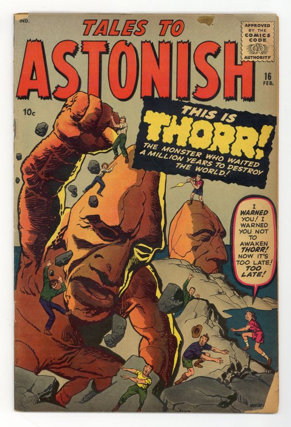 Cover by Jack Kirby and Steve Ditko. Here Comes...Thorr the Unbelievable, art by Jack Kirby and Dick Ayers; When Professor Linus mistakenly wakes up Thorr the Unbelievable he has to stop him from waking up his fellow warriors and taking over the world. The Bridge text story. My Touch Means... Doom!, art by Don Heck; A teller plans to rob his bank to pay for his wife's surgery. Save Me from the Mole Men!, art by Paul Reinman; A fighter who is cruel and likes to hurt his opponents finds out that there are some creatures stronger than him, and they like to hurt their opponents also. I Am the Victim of the Sorcerer!, art by Steve Ditko. 36 pgs., full color. $0.10. Cover price $0.10.