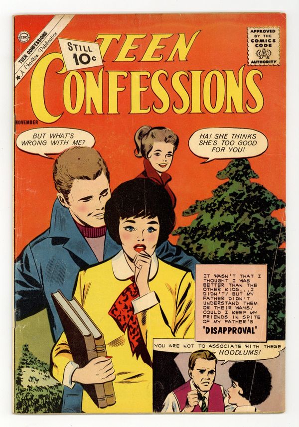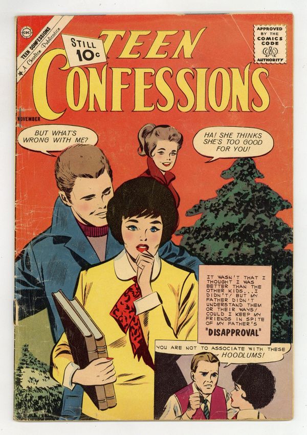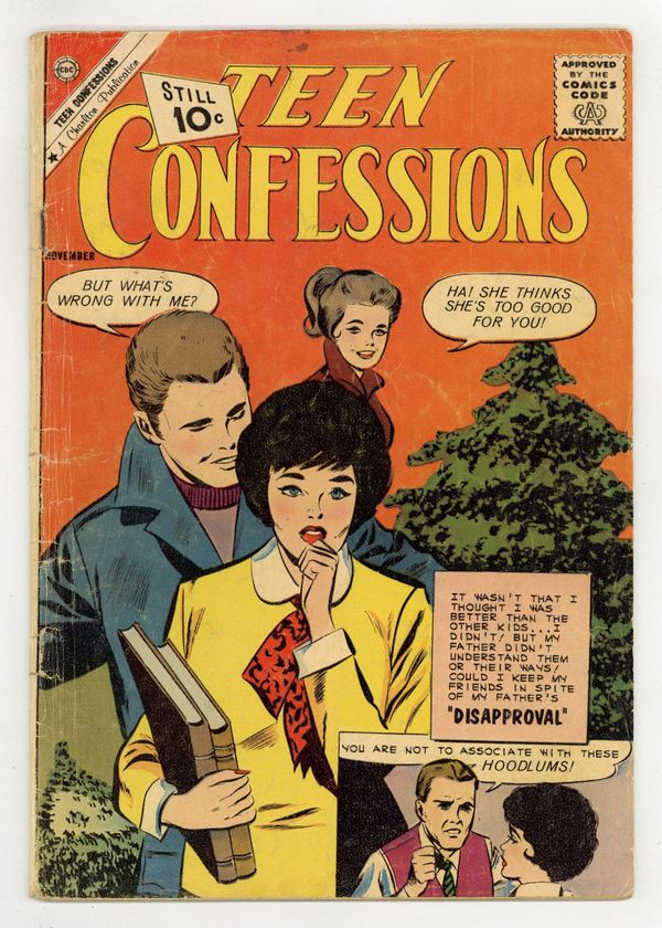 Published Nov 1961 by Charlton Comics Group.$36.00Cover by Joe Sinnott and Vince Colletta. Stories by unknown. Art by Joe Sinnott, Vince Colletta and unknown. It wasn't that she thought she was better than the other kids...she didn't! But her father didn't understand them or their ways! Could she keep her friends in spite of her father's..."Disapproval"? Find out in this tale with art by Joe Sinnott and Vince Colletta. Also in this issue: "No Happy Love..." with inks by Colletta; "Catch a Hero!" with inks by Colletta; and 2-page text story "Love or Love?" 32 pages, full color. Cover price $0.10.