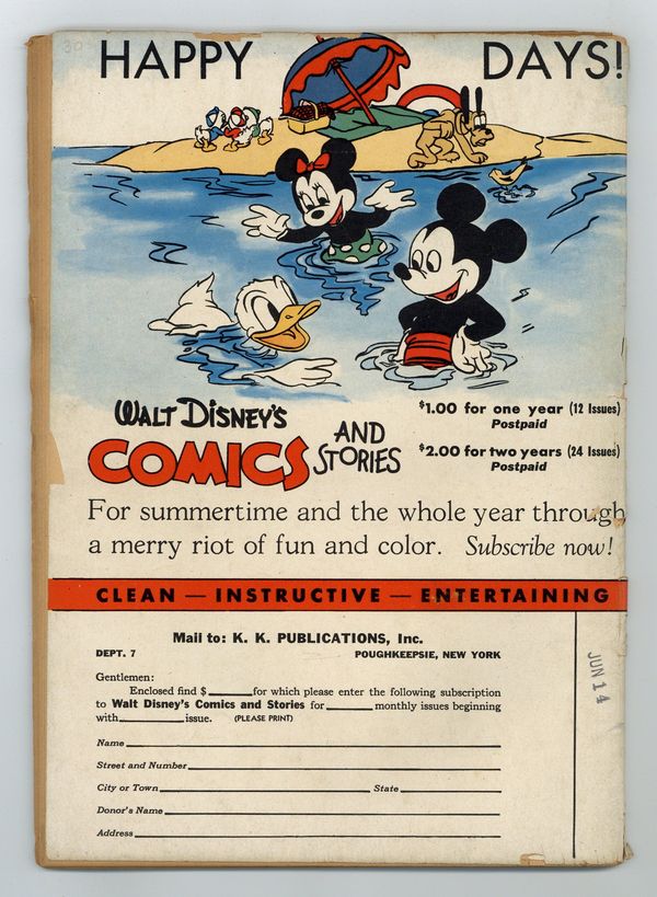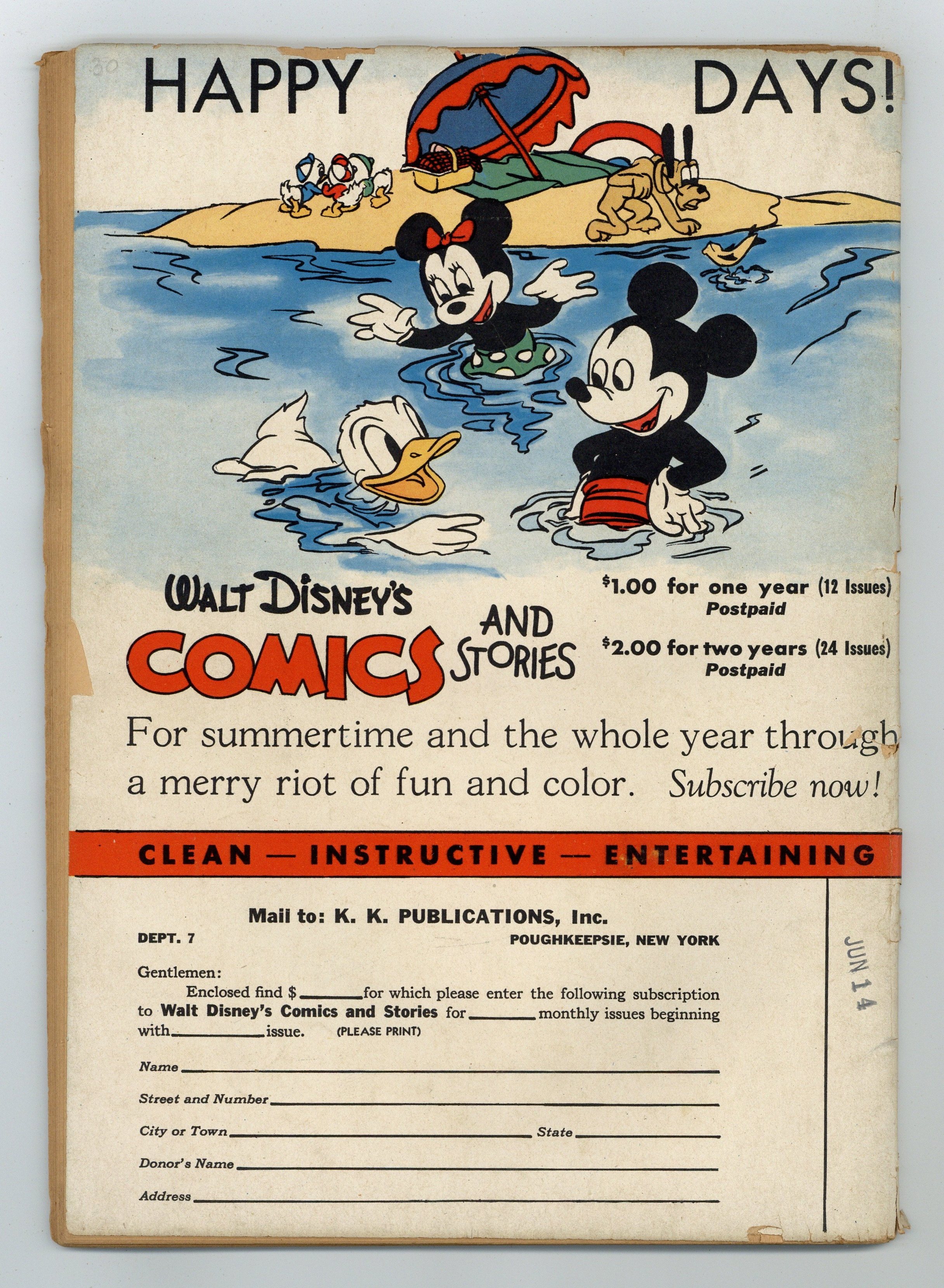 Cover by Walt Kelly. Stories and art by Walt Kelly, Carl Barks, Floyd Gottfredson, Ted Thwaites, Merrill De Maris, Bob Karp, Bob Wright, and Al Taliaferro. Sometimes listed as Vol. 3 #10. The long-running vehicle for Disney character comics featured early work by Carl Barks, the legendary Good Duck Artist. In a classic Floyd Gottfredson story from the Mickey Mouse comic strip, hotel detective Mickey investigates ghosts in the haunted hotel. In a story by Barks featuring the first appearance of Donald's rival-next-door Neighbor Jones, Donald tries to out-do him in doing good deeds. Walt Kelly contributes the first of many Gremlin stories, including a paper doll of Gremlin Gus. Gremlins cover by Kelly. Clara Cluck; New-Fangled Fountains; The Twins Fix Everything; The Skeptic; How To Play Golf; Unhorsed; Duck!; Possum; Surrounded; Gremlin Gus and the Widgets; Mickey Mouse, Bellhop Detective; Hollywood Chatter; The Unknown; Convincing Evidence; Roundabout Revenge; No Eggs; Peace and Quiet; A Modern Invention; Duckmobile; Mental Picture; Fourth of July Fun; Trolley Car Troubles; Love Daisy, Love Her Dog; Heads Down!; Common Knowledge; The Price of Popularity; Quick Turnover; X Marks the Spot; Only God Can Make a Tree; Better Bizzness Expert; The Cold-Blooded Penguin; The Loser; Fun on a Rainy Day; It's a Lye!. 64 pages, Full Color. Cover price $0.10.