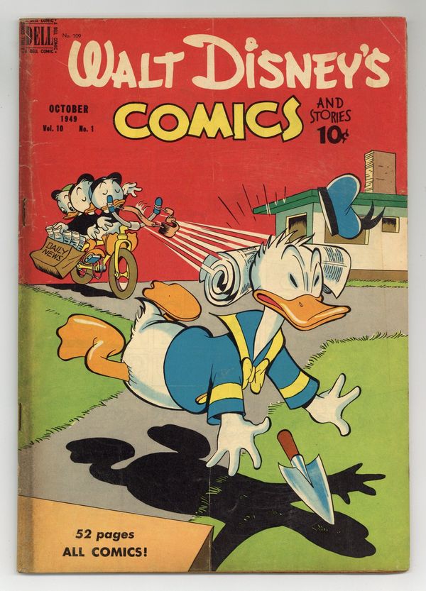 Tags: Disney Ducks & MicePublished Oct 1949 by Dell/Gold Key.$22.50Cover by Carl Barks. Stories and art by Carl Barks, Floyd Gottfredson, Bill Walsh, Dick Moores, Bob Karp, Gil Turner, George Waiss, Bill Wright, Manuel Gonzales, and Al Taliaferro. Sometimes listed as Vol. 10 #1. The long-running vehicle for Disney character comics featured work by Carl Barks, Floyd Gottfredson, and Pogo's Walt Kelly. In a classic story from the Mickey Mouse comic strip, Mickey gets a clue to the ghosts' secrets when he finds secret passages in Colonel Bassett's mansion. In a story by Barks, Donald is skeptical that his nephews' divining rod really works. Pinocchio leads the search after Gepetto's fish Cleo is fishnapped. Donald Duck; Bucky Bug; Li'l Bad Wolf; Mickey Mouse; Apples for the Teacher; Pinocchio; Mickey Mouse in the House of Seven Haunts. 48 pages, Full Color. Cover price $0.10.
