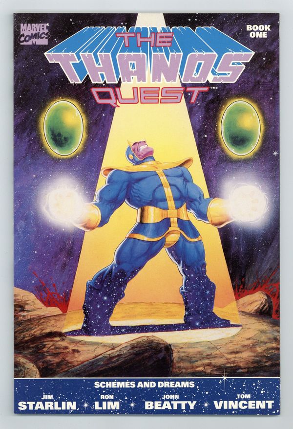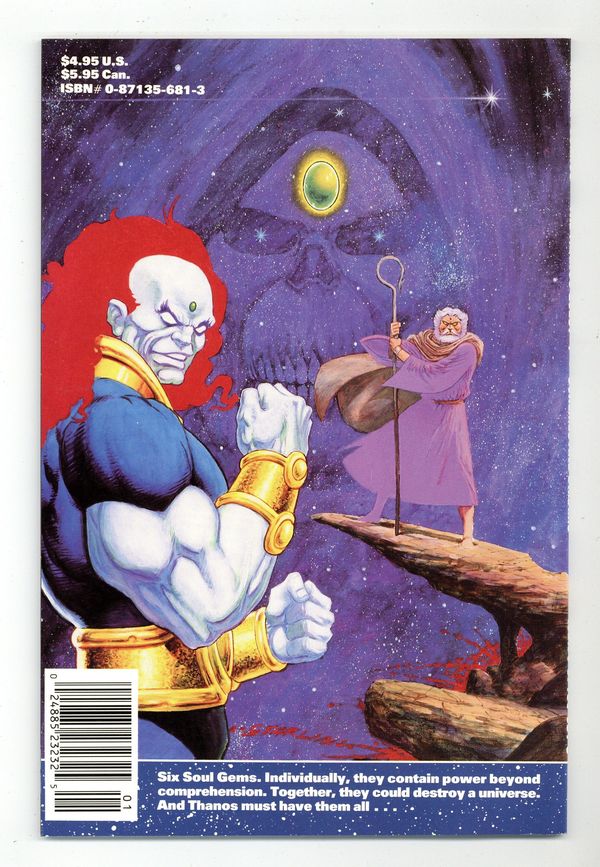 1st Printing. "Schemes and Dreams!" Written by Jim Starlin. Art by Ron Lim John Beatty. Six Soul Gems. NOTE: This tale picks up after the events of Silver Surfer (1987 2nd Series) #38. Thanos the Mad Titan has been resurrected by the entity known as Death. Resurrected and given a dark mission. In order to accomplish this mission, Thanos will seek ultimate power - the Soul Gems! Individually, they contain power beyond comprehension. Together, they could destroy a universe. And Thanos must have them all.… Featuring the Elders of the Universe Champion and Gardiner, and the nefarious In-Betweener. 48 pages, FC Cover price $4.95.