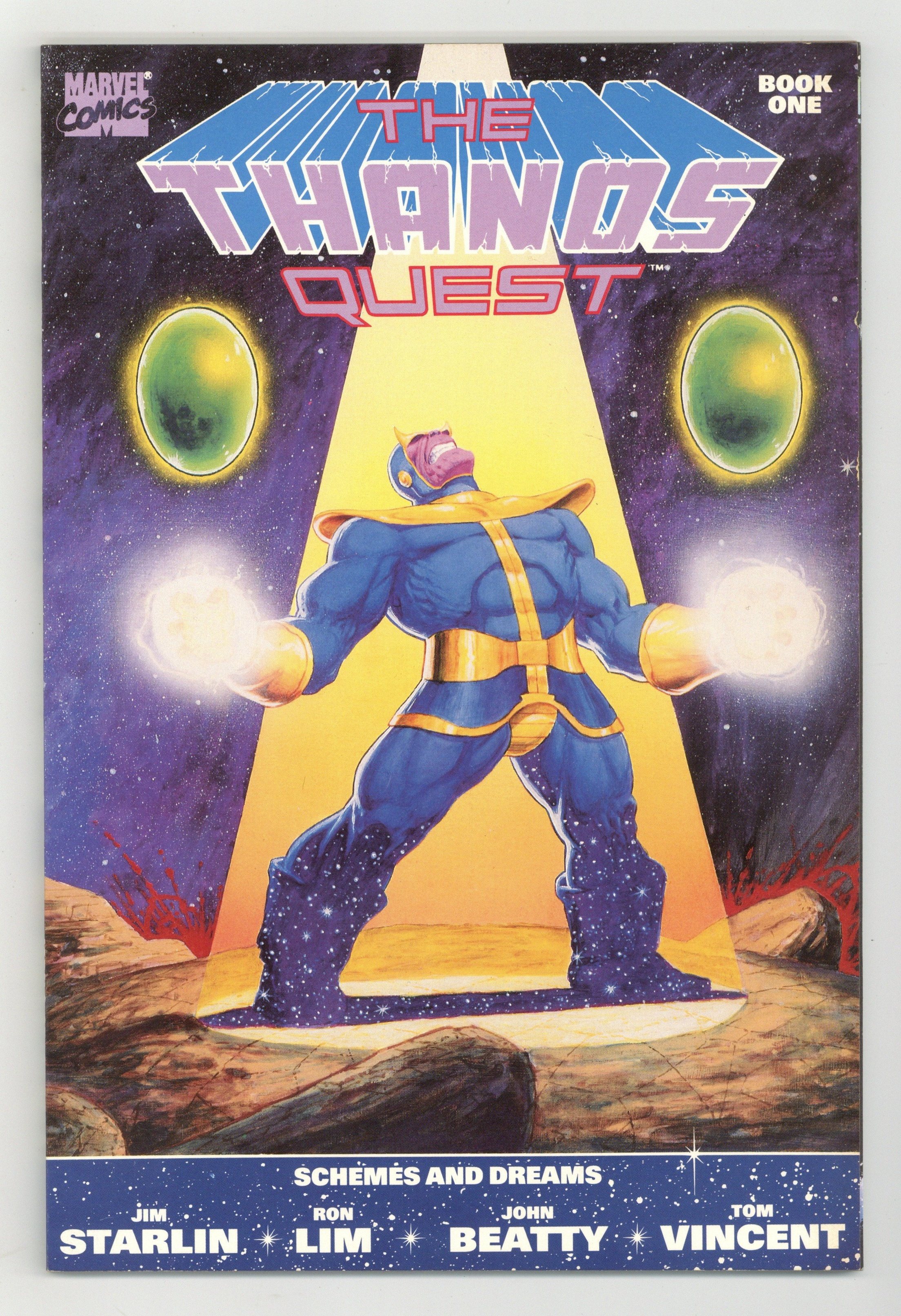 Tags: Infinity Gauntlet (part 0.05)$23.001st Printing. "Schemes and Dreams!" Written by Jim Starlin. Art by Ron Lim John Beatty. Six Soul Gems. NOTE: This tale picks up after the events of Silver Surfer (1987 2nd Series) #38. Thanos the Mad Titan has been resurrected by the entity known as Death. Resurrected and given a dark mission. In order to accomplish this mission, Thanos will seek ultimate power - the Soul Gems! Individually, they contain power beyond comprehension. Together, they could destroy a universe. And Thanos must have them all.… Featuring the Elders of the Universe Champion and Gardiner, and the nefarious In-Betweener. 48 pages, FC Cover price $4.95.