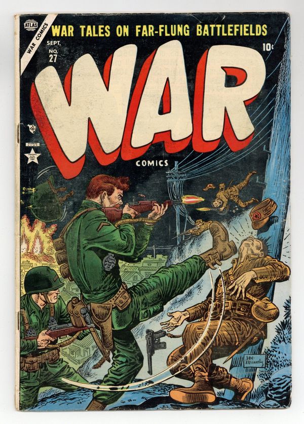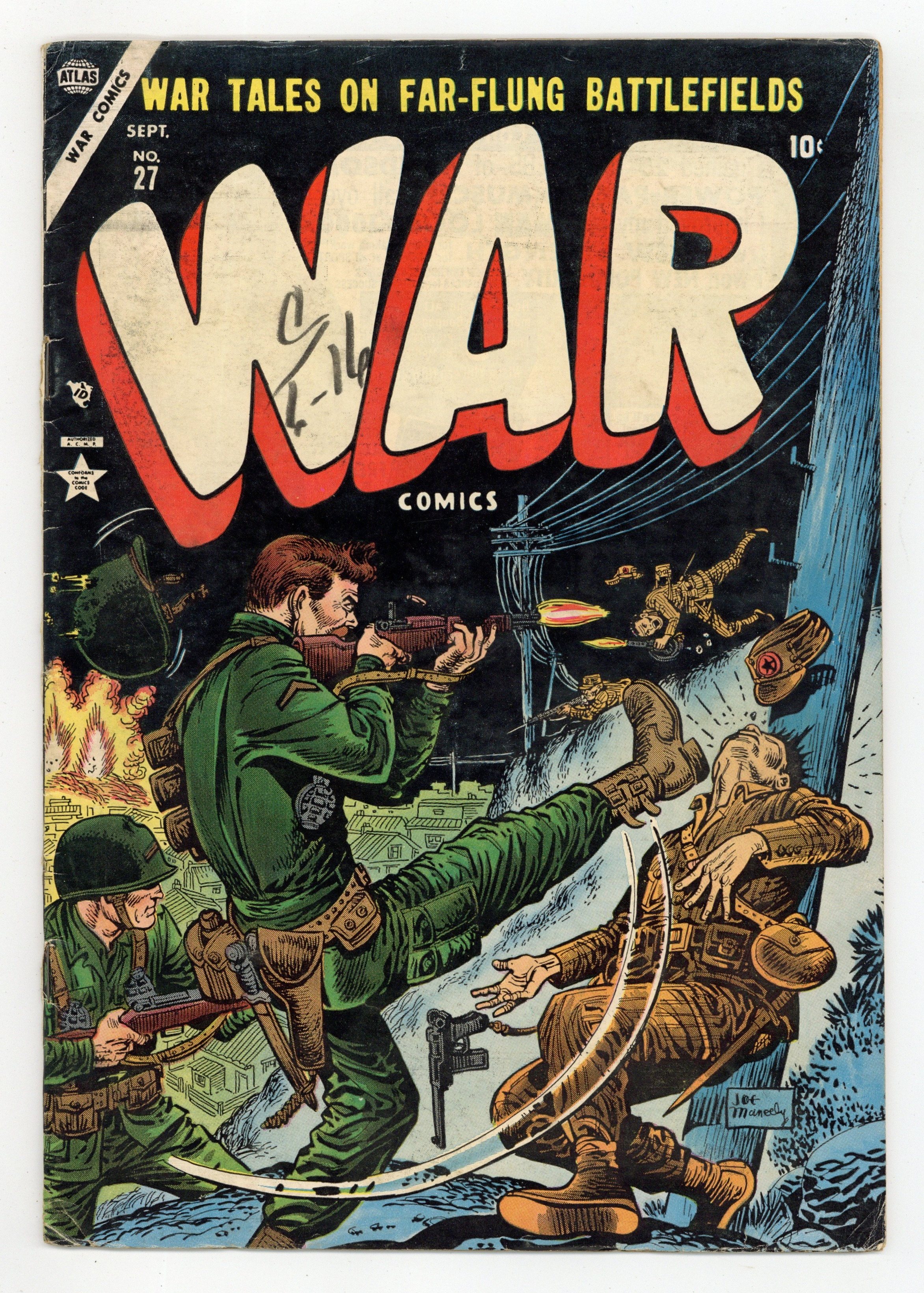 "F-80" (art by Bill Walton), "The Battle of Jutland" (art by John Severin), "The General" (art by Louis Ravielli), and "Paratroops" (art by Gil Evans), plus a two-page text story, "Child's Play." Joe Maneely cover. Cover price $0.10.
