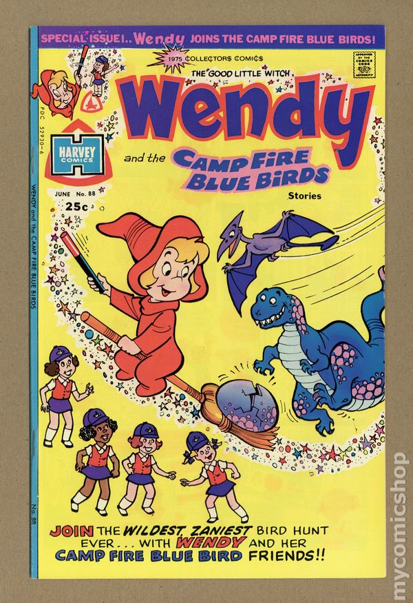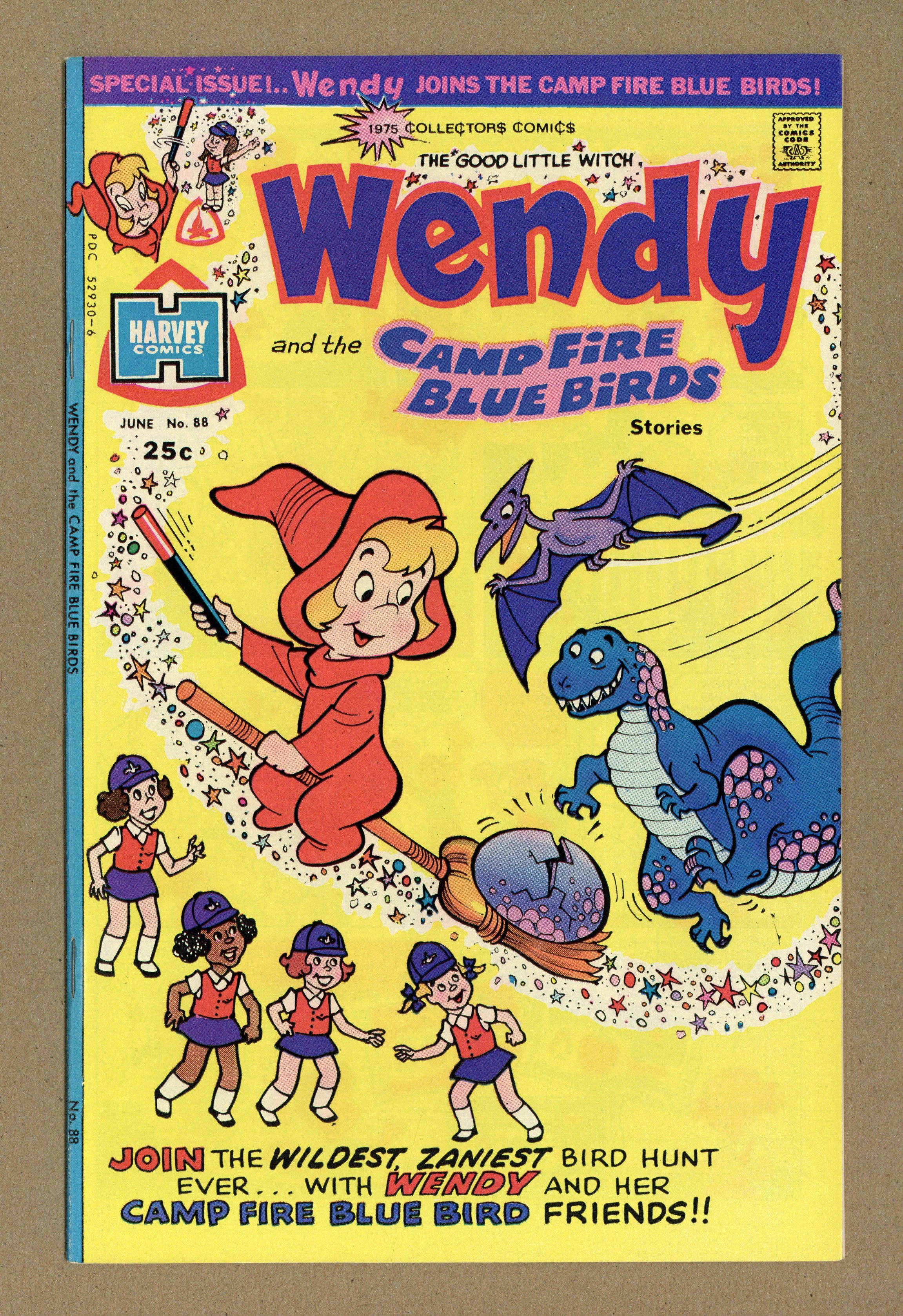 $8.60"Project Save the Bluebirds"; Wendy's aunt Helpful Hannah tries to help Wendy and her fellow Camp Fire Blue Birds with their project to save the bluebirds. Untitled one-page story; Casper's description of what Wendy does at her Blue Bird meetings turns the Witch Sisters' brew sweet, to their disgust. "Helpful Hannah Helps Again"; Helpful Hannah leads the girls to Aunt Twitter's farm to look for bluebirds, but Aunt Twitter hasn't seen any this year. "Magic!"; Helpful Hannah tries to conjure up a bluebird but instead gets a blue dinosaur; The girls go back home and see bluebirds moving into the birdhouse they had built. "You Had to Be There!" text story with Wendy. "Which Witch Laughs Last?"; When the other Blue Birds surprise Wendy by showing up at her house, Wendy's aunts try to play a joke on them. 36 pages, full color. Cover price $0.25.