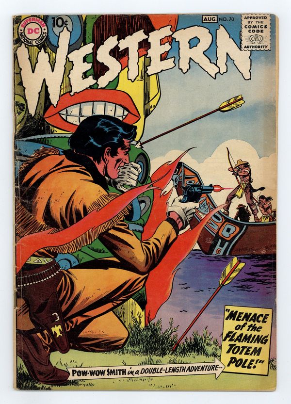 Cover pencils by Gil Kane, inks by Joe Giella. The Menace of the Flaming Totem Pole starring Pow Wow Smith, script by Gardner Fox, art by Carmine Infantino. Prisoner in the Sky starring Nighthawk, script by Gardner Fox, pencils by Gil Kane, inks by Joe Giella. Mystery of the Bearded Prospector starring the Wyoming Kid, script by Gardner Fox, art by Howard Sherman. 36 pgs. $0.10. Cover price $0.10.
