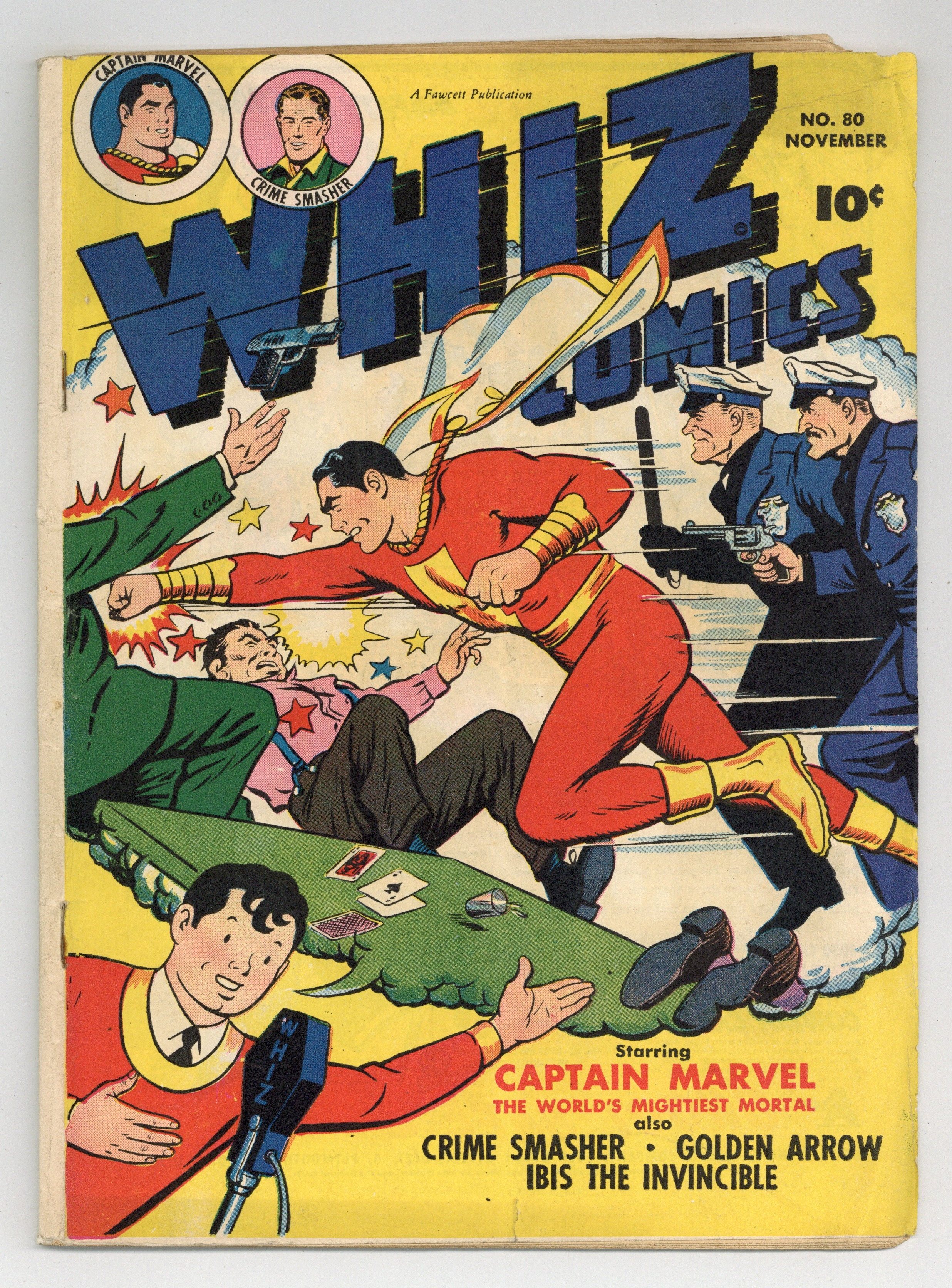 Cover by C. C. Beck. Stories and art by Basil Wolverton, Otto Binder, Bernie Krigstein, Howard Boughner, Ken Bald, Gus Ricca and Bill Woolfolk. The Fawcett comic that introduced the original Captain Marvel (Shazam) to the world. Golden Arrow dresses as William Tell for a Mardi Gras party, but doesn't know why someone would want to steal his apple, in a story with early art by EC legend Bernie Krigstein. When Taia's soul is captured by the witches of Bald Mountain, only Ibis and his Ibistick can save her. Plus a "Culture Corner" strip by legendary cartoonist Basil Wolverton, featuring useless but hilarious advice on "How to Go Soak Your Head." Captain Marvel and the Junkman Mystery!; Whitey Whiskers and Daniel Boone Jr.; Golden Arrow and the Mardi Gras; Whipper-Snappers; Whiz Quiz; Wilbur the Waiter; The Spot; The Culture Corner; Ibis the Invincible: The Witches' Sabbath; Doc Sorebones; Ezra of the Ozarks; Figure Frets; Mickey the Monitor: Master Strategist; Crime Smasher: Peak of His Career. 48 pages, Full Color. Cover price $0.10.