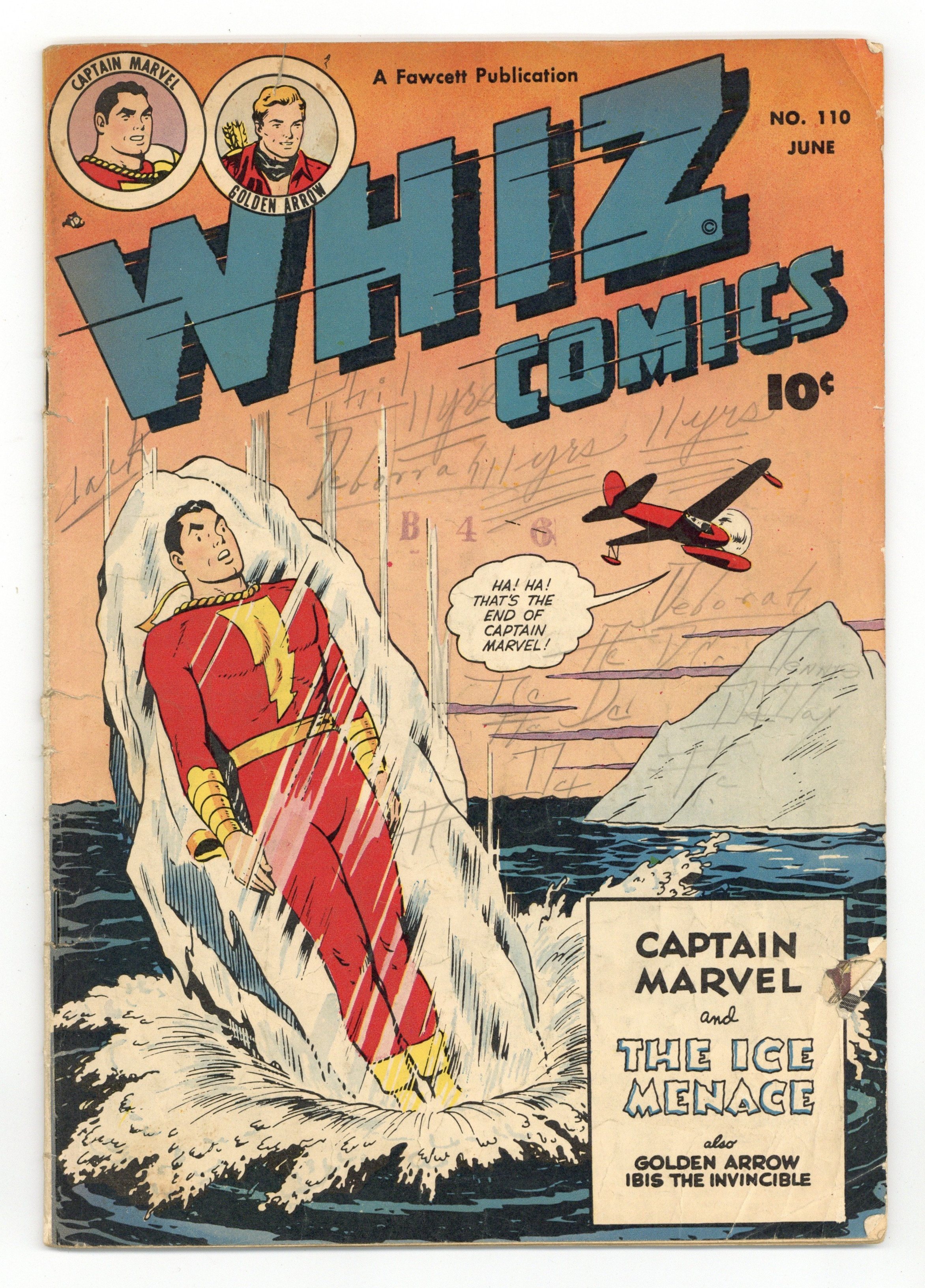 $59.00Cover by C.C. Beck. Stories and art by Otto Binder, Kurt Schaffenberger and Bill Woolfolk. The Fawcett comic that introduced the original Captain Marvel (Shazam) to the world. Frustrated artist Gideon Gleet decides to freeze various 20th-century objects for future posterity, including Captain Marvel. Those who lose at Mr. Mammon's gambling house find their souls forfeit to the Devil (who looks like a cross between The Shadow and Dr. Strange). Golden Arrow learns the crooked mayor is making puppets of the citizens of Rocky Ridge. Captain Marvel: The Ice Fiend; Wilbur the Waiter; Golden Arrow: A Song of Justice; Wicky and O'Shawnessy; Ibis the Invincible: His Greatest Gamble. 32 pages, Full Color. Cover price $0.10.