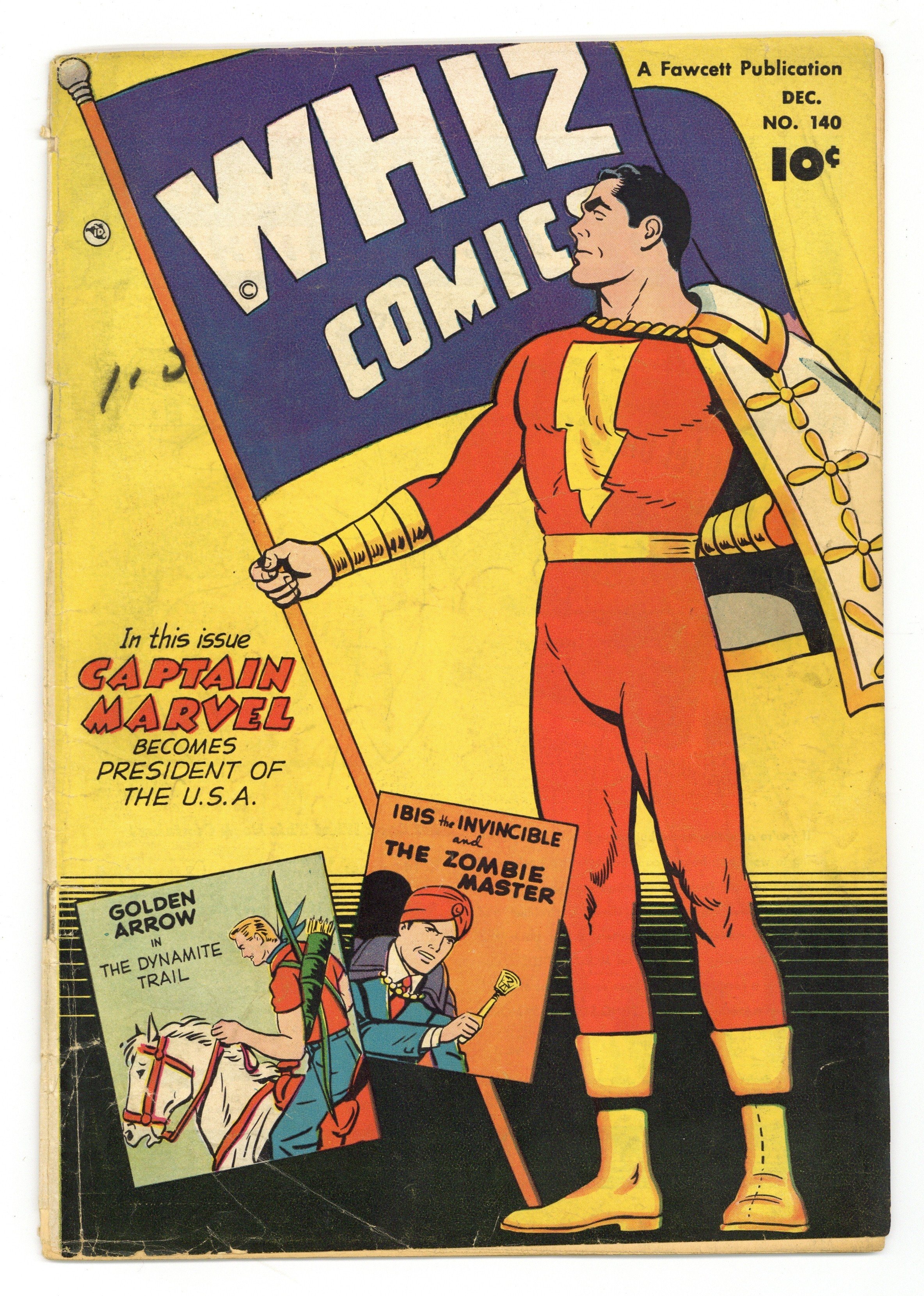 Stories and art by Bill Woolfolk, Otto Binder, Charlie Tomsey, Anthony Cataldo, and Kurt Schaffenberger. The Fawcett comic that introduced the original Captain Marvel (Shazam) to the world. Captain Marvel becomes President of the U.S.A. Lance and Mike track pirates who are targeting pearl shipments. When a rancher finds gold on his property, it brings the sort of trouble only Golden Arrow can rectify. Captain Marvel Becomes President of the U.S.A.; Colonel Corn and Korny Kobb; Lance O'Casey: The Pearl Pirates; Golden Arrow: Dynamite Trail; Wicky and O'Shawnessy; Ibis the Invincible: The Zombie Master; Doc Sorebones. 32 pages, Full Color. Cover price $0.10.