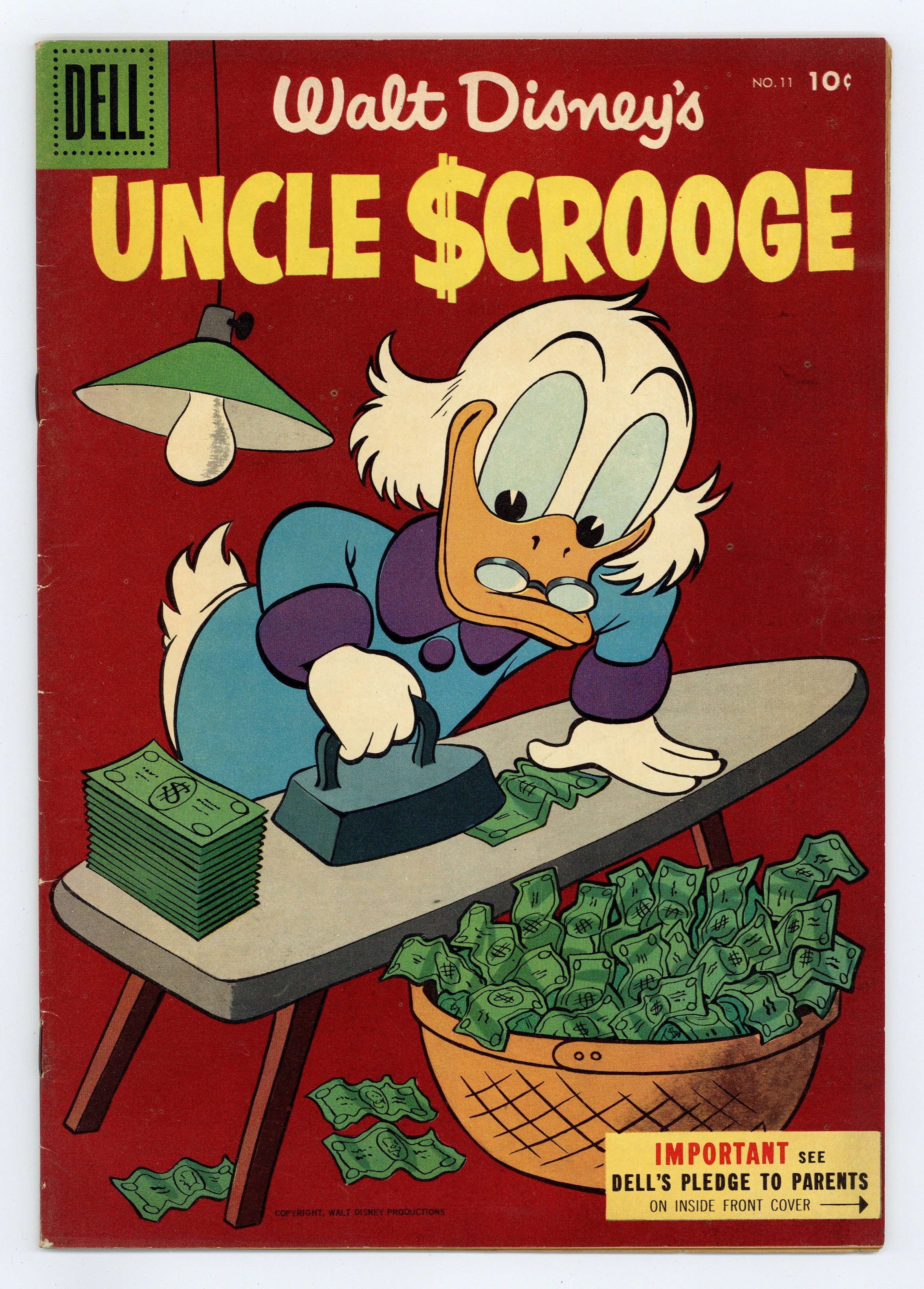 Published Nov 1955 by Dell/Gold Key/Whitman.$30.00No ads in book. Entire issue from cover to cover is comic stories and one page strips. Uncle Scrooge in "The Great Steamboat Race" in which he engages in a steamboat race to settle an old family squabble and "Riches, Riches, Everywhere!" in which Scrooge tries to prove to Donald and the nephews that he can find riches anywhere. Stories by Carl Barks. 36 pages, full color. Cover price $0.10.