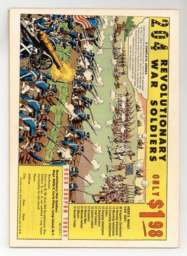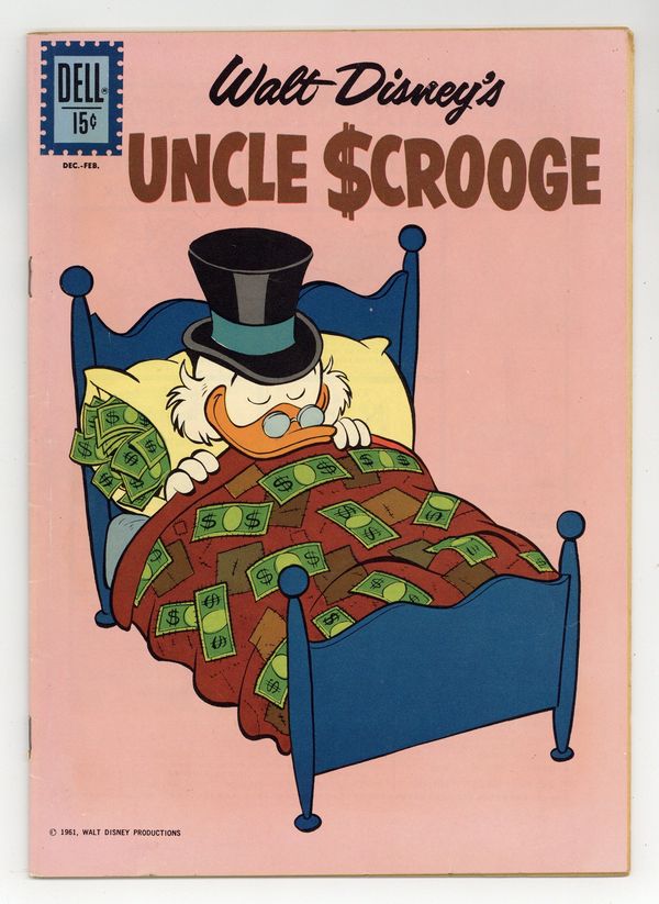 Cover by Carl Barks. Stories and art by Carl Barks, Tony Strobl, Steve Steere and John Liggera. Comics legend Carl Barks creates his masterpiece, featuring the adventures of Donald Duck's Uncle Scrooge, the richest duck in the world. When Scrooge accidentally gives witch Magica De Spell the very first dime he ever earned, Scrooge, Donald, and his nephews must track her down and get it back. This story features the first appearance of Magica De Spell and "the Old Number One Dime." Gyro Gearloose is called in after a giant robot built for a movie runs amuck. Scrooge tries to break a goat of its habit of eating money. The Midas Touch; Gyro Gearloose: Duckburgs Day of Peril; The New Hat; Money Bag Goat; The Bends; Green Stuff; Memory Man. 32 pages, Full Color. Cover price $0.15.
