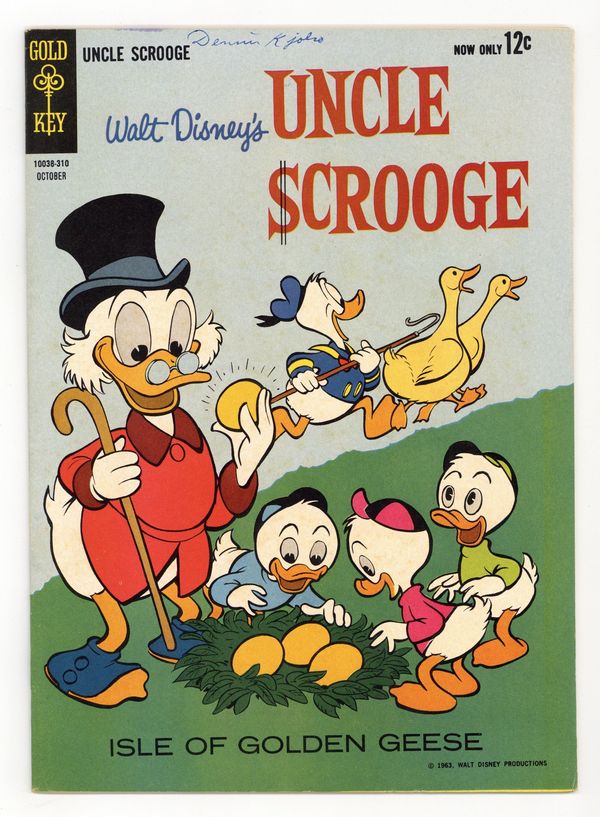 Published Oct 1963 by Dell/Gold Key/Whitman.$15.50Cover by Carl Barks. Stories and art by Carl Barks, Vic Lockman, Paul Murry, Tony Strobl, Steve Steere and John Liggera. Comics legend Carl Barks creates his masterpiece, featuring the adventures of Donald Duck's Uncle Scrooge, the richest duck in the world. Scrooge takes Donald and his nephews with him to find Featherbrain Island, where the geese lay golden eggs - but Magica De Spell and the Beagle Boys want to get there first. Scrooge is so rich, he even has a chauffeur for his motor scooter. Isle of Golden Geese; The Tricky Trick; Gyro Gearloose: Day of Delayed Action; The Travel Tightwad. 32 pages, Full Color. Cover price $0.12.