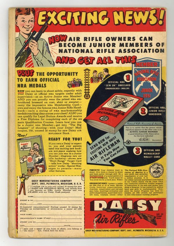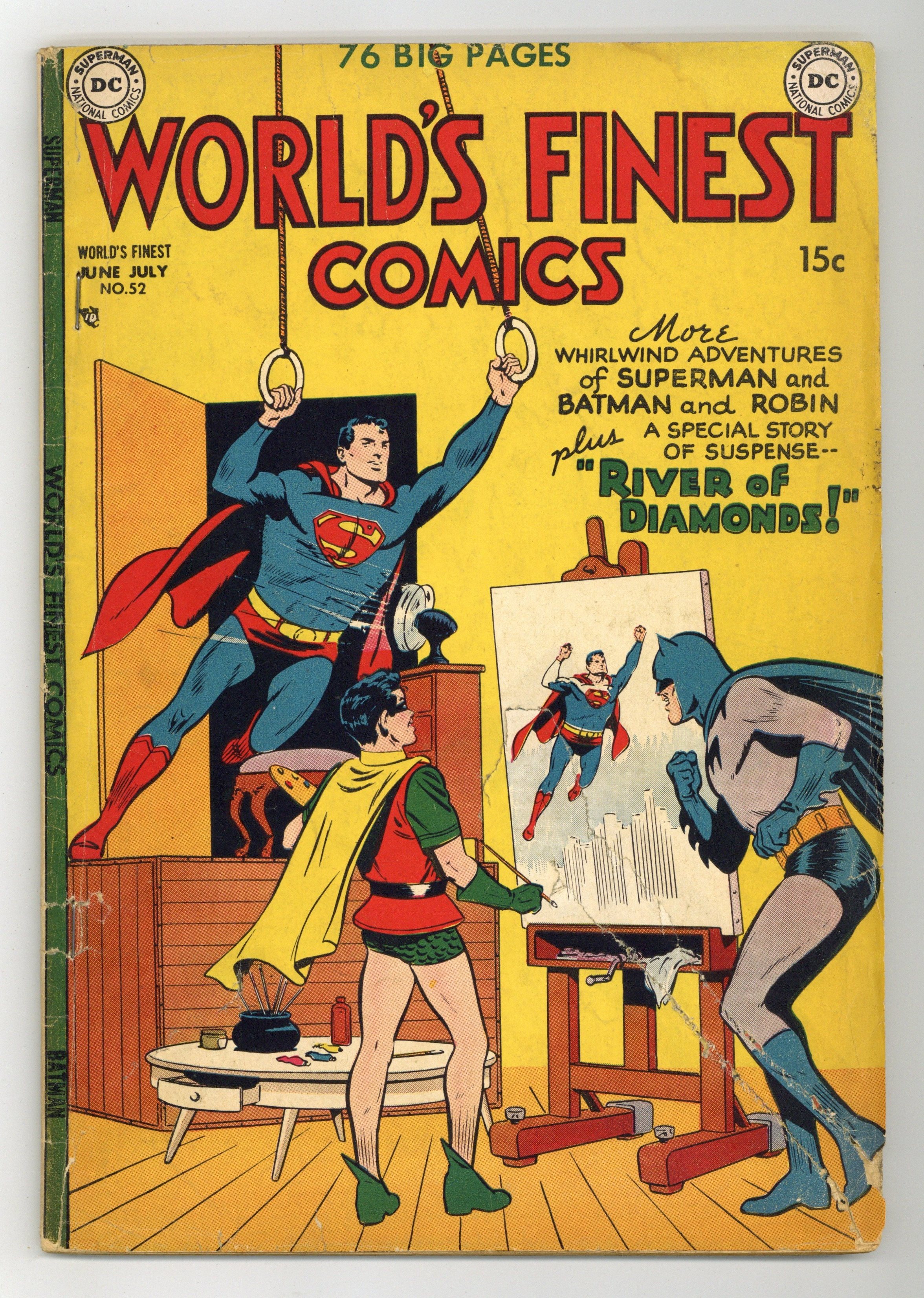 Cover art by Winslow Mortimer. The Man Who Swindled starring Superman, pencils by Wayne Boring, inks by Stan Kaye. The Spirit in the Box starring the Wyoming Kid, script by Gardner Fox, art by Howard Sherman. Always Look Up--- Shorty humor half-pager by Henry Boltinoff. River of Diamonds starring Danger Trail, inks by Frank Giacoia. Little Pete humor page by Henry Boltinoff. Casey the Cop humor page by Henry Boltinoff. En Garde text article by B. Fairbanks. A Sword, A Rifle, and A Bow starring Green Arrow, art by George Papp. Inventor to the Underworld starring Tom Sparks, Boy Inventor, pencils by Bob Brown. The $1,000,000 Star Club starring Batman, script by David Vern, pencils by Bob Kane (Batman & Robin figures) and Lew Sayre Schwartz, inks by Sy Barry. Know Your Country public service announcement starring Superboy, script by Jack Schiff, art by Win Mortimer. 76 Pages, Full Color. Cover price $0.15.