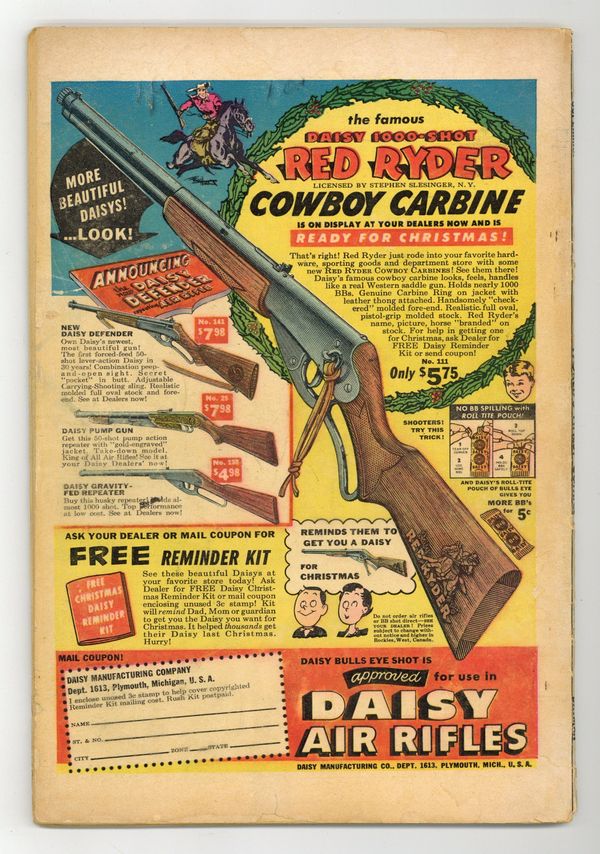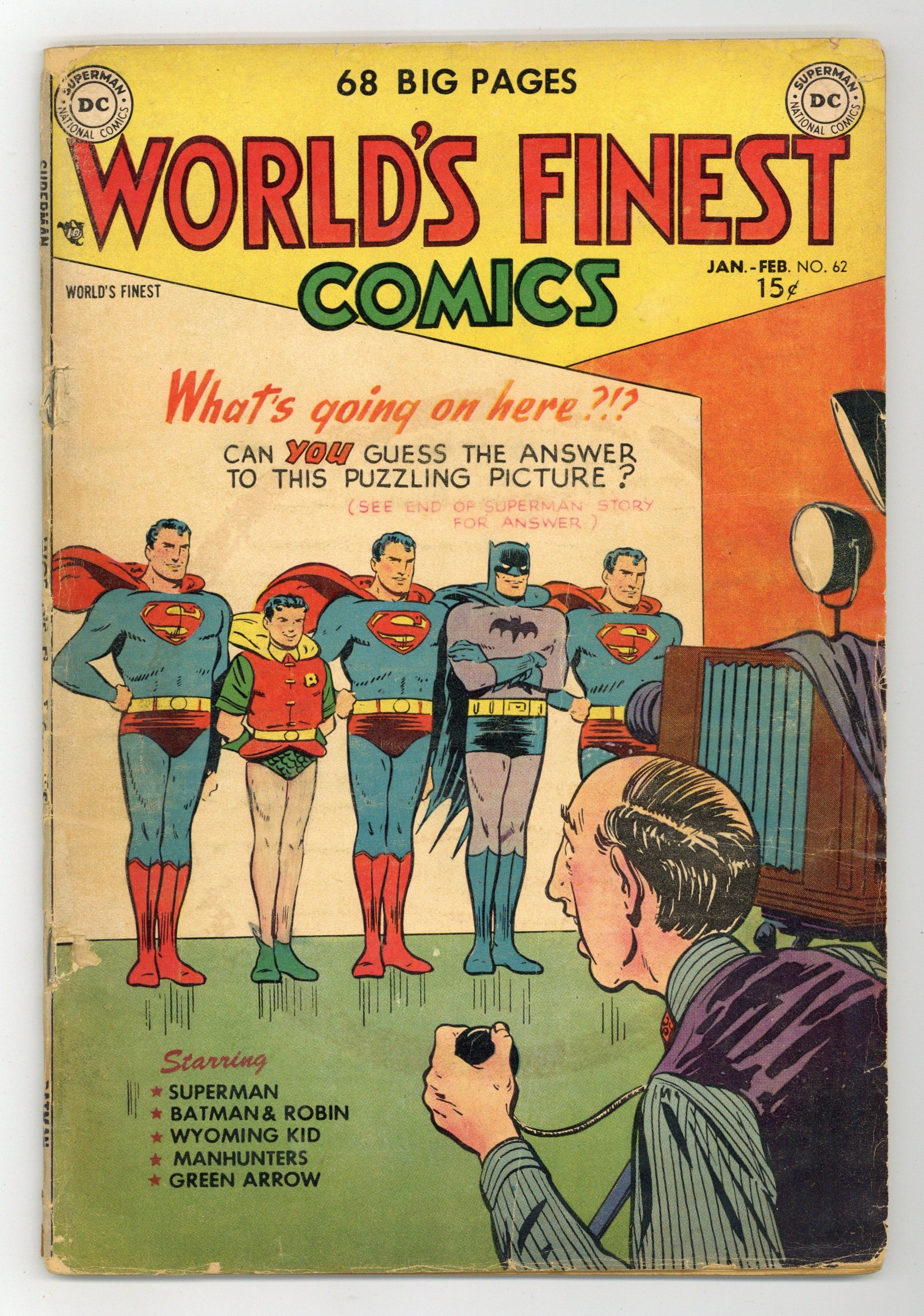 Cover art by Winslow Mortimer. The Seven Secrets of Superman starring Superman and Lex Luthor, script by Edmond Hamilton, pencils by Wayne Boring, inks by Stan Kaye. Free Speech -- Free for All! public service announcement starring Buzzy, script by Jack Schiff. The Black Magician starring Green Arrow, art by George Papp. A New Kind of Junior Sport public service announcement starring Superboy, script by Jack Schiff, art by Win Mortimer. Super Sleuth McFooey story, script and art by Jack Farr. The Gold Squad starring Manhunters Around the World, pencils by Curt Swan. Jerry The Jitterbug humor page by Henry Boltinoff. The Million Dollar Coin starring Wyoming Kid, script by Gardner Fox, art by Bruno Premiani. Hair on Their Faces text article by Dick Keene. Sir Batman and the Black Knight starring Batman, Commissioner Gordon, and the Black Rogue, script by David Vern, pencils by Dick Sprang, inks by Charles Paris. 68 Pages, Full Color. Cover price $0.15.