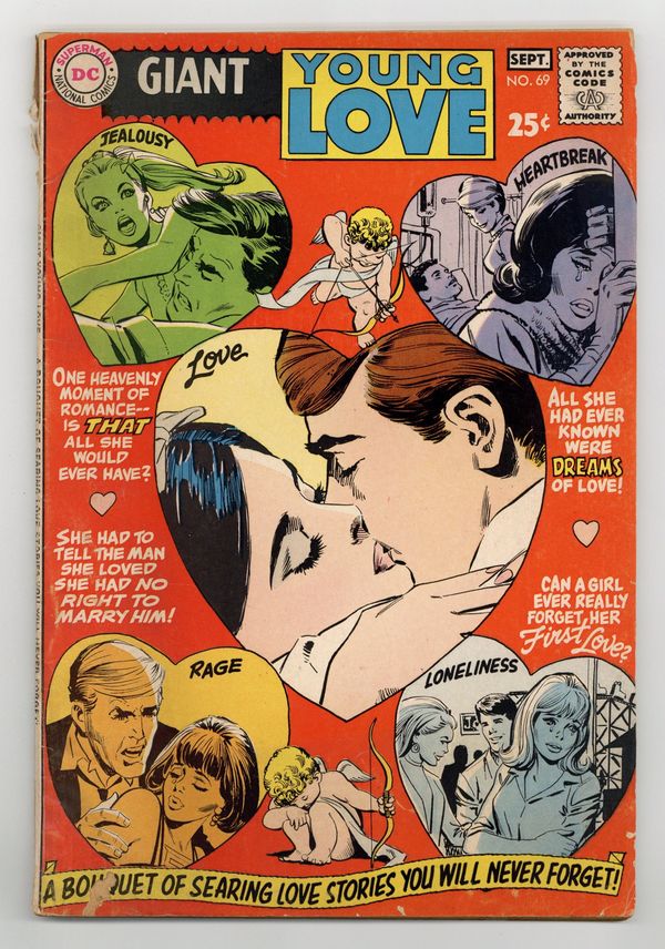 Cover by Dick Giordano. Stories by unknown. Art by John Romita, Sr., Werner Roth, Jay Scott Pike, Bill Draut, Bernard Sachs and unknown. Giant-size issue of reprint love stories you will never forget! Ginger fears that her sister Jean is going to steal her boyfriend Roger as she has others in the past in "Tears for a Dream!" Plus: Ginny has read lots of books about how to attract a man, and she follows all the rules when she meets Les Harper. But though they share many interests and spend all their free time together, Les ends up resenting her for monopolizing him. Ginny takes some advice from his mother and backs off until he comes back to her in "Heartbreak in Paradise!" Also: When rich Rory Maxwell pursues Mary Lou, she can only remember the way he treated her when they were children and she thinks he's laughing at her all over again. He stops her from leaving town at the last minute by proposing marriage in "A Shoe for Cinderella!" And: When Mary falls in love with Curtis, she doesn't know he was previously engaged to her late sister in "Moment of Truth!" Plus: Paul and Leslie have an argument and separate but he never stops hoping she will return in "To Hide From Love!" Also: Though she tries mightily to resist, Nola falls in love with Jack, but she has not told him that she is dying in "Forgive Me, Forget Me!" And: Producer Victor tells Brenda that she's all wrong for a role in the play he's casting because she has never been in love. She meets a younger man and finally begins to understand what love is, but learns that he has only been trying to get her to introduce him to her producer friend. Luckily, it turns out that Victor has been in love with her the whole time in "Curtain for a Heart!" Plus: four Mad Mad Modes for Moderns 2-pagers! Softcover, 64 pages, full color. Cover price $0.25.