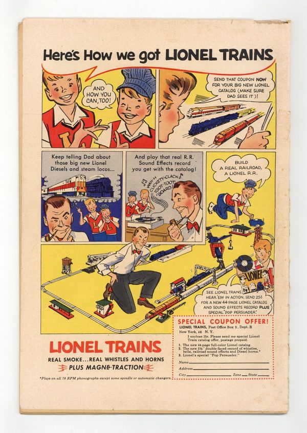 "Bird-Treat Cheat!"; Veronica decides that Betty, Jughead, and Reggie should build bird houses because so many trees were being cut down for new buildings. "Yells and Belles"; Archie and Reggie apply for the position of cheerleading coach; The two babble on to Betty about their plans, which don't include her. "Behavior Pattern," art by Joe Edwards; Betty and Veronica think Archie and Reggie are trying to assassinate each other. Ad for Archie's Pal Jughead and Archie's Joke Book. "Lip Service," script by Frank Doyle, art by Bill Vigoda; Betty tips Archie to a prank with lipstick that Reggie and Veronica are playing on him. "Christmas Jeer" text story starring Betty and Veronica. "Hook, Line, and Stinkers!"; Reggie and Archie are going fishing instead of taking the girls to the movies. 36 pgs., full color. $0.10. Cover price $0.10.