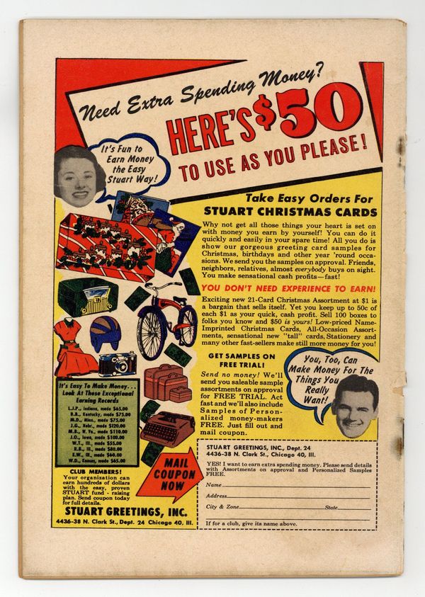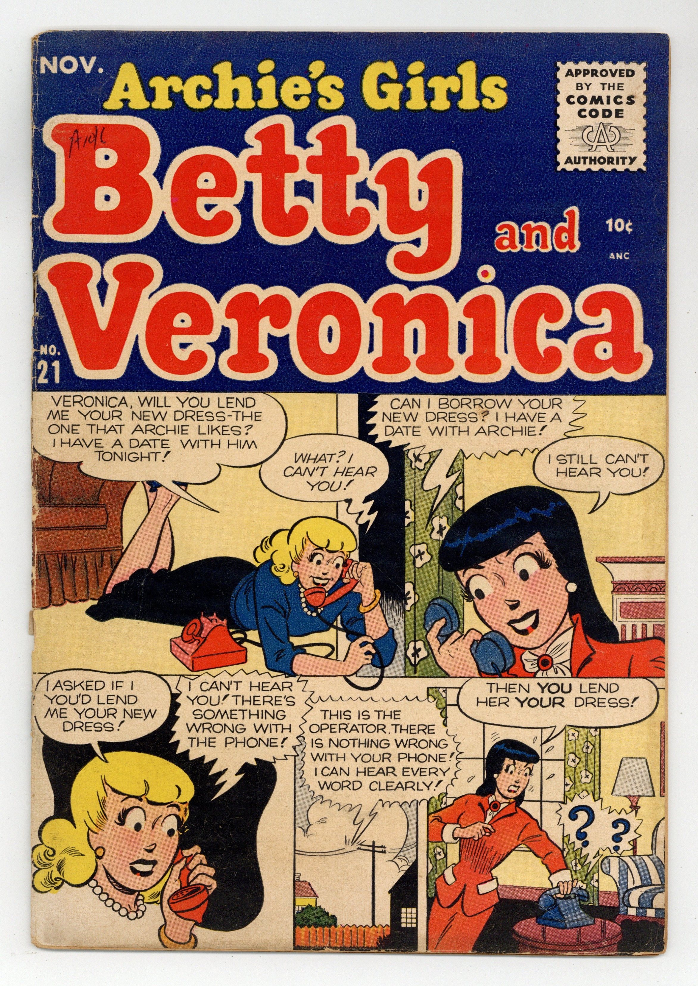 Cover art by Samm Schwartz. "Language Barrier," art by Samm Schwartz; Archie is failing French and the girls conspire to keep him from being tutored by some lovely senior class student. "Swell Smell," pencils by Dan DeCarlo, inks by Vincent DeCarlo; Betty has a close encounter with a squad of soldiers. "The Weaker Sex," pencils by Dan DeCarlo, inks by Vincent DeCarlo; Veronica being a weak little girl is all in Archie's head, and she aims to keep it that way. "Finale Blow," pencils by George Frese, inks by Joe Edwards; Betty makes a late-night phone call to Veronica. "Loan Rider," pencils by George Frese, inks by Joe Edwards; Archie decides he's going to outwit Reggie's attempt to borrow something. "The Long Count," pencils by Dan DeCarlo, inks by Rudy Lapick; Veronica makes Archie wait while she changes. "Food for Thought," pencils by Dan DeCarlo, inks by Rudy Lapick; Betty complains to Jughead about being leered at. "Date Bait," art by Samm Schwartz; Betty tries to get lunkhead Archie to kiss her. "The Nose Knows," pencils by Dan DeCarlo, inks by Rudy Lapick; Veronica buys an expensive new perfume to impress Archie. "Hope Opera," art by Samm Schwartz; Betty begins comparing Archie to the character on her favorite radio soap opera and Archie isn't measuring up. "Mind Over Matter," art by Samm Schwartz; Veronica is smitten with an older man, a friend of her father, and no longer has time for Archie or Reggie. "Heaven Bent," pencils by Dan DeCarlo, inks by Rudy Lapick; Archie wrecks his car while touring lover's lane with Veronica. "One of the Crowd," art by Joe Edwards; Wilbur tries to make a new student feel welcome. "An Eye for Beauty," pencils Samm Schwartz; Veronica tries to sabotage Betty's chances with Archie using her new designer eyeliner. "On the Prowl," pencils by Dan DeCarlo, inks by Rudy Lapick; Betty tries to impress a handsome neighbor. 36 pgs., full color. Cover price $0.12.