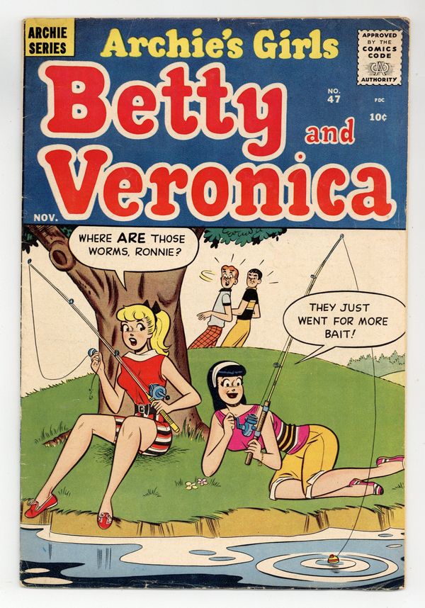 Cover pencils by Dan DeCarlo, inks by Rudy Lapick. The Peacemaker, script by Frank Doyle, pencils by Dan DeCarlo, inks by Rudy Lapick; Betty and Veronica are spotted having a heated argument; Archie assumes they're fighting over him and doesn't mind telling anyone who will listen. Biography of Roger Smith, one of the co-stars of the TV show "77 Sunset Strip." Headline Hunters, script by Frank Doyle, pencils by Dan DeCarlo, inks by Rudy Lapick; Betty has a phony newspaper printed, with a phony story about a beach-side beauty contest, to con Archie and Reggie into taking her and Veronica to the beach. Fairway Or Fowl, script by Frank Doyle, pencils by Dan DeCarlo, inks by Rudy Lapick; Betty overhears Archie and Reggie talking about their golf games and thinks they've taken up hunting again. Trail Blazers, script by Frank Doyle, pencils by Dan DeCarlo, inks by Rudy Lapick; Betty and Archie plan to go to the dance in matching loud blazers. Immediately Veronica starts plotting on how to sabotage the plan. 36 pgs. $0.10. Cover price $0.12.