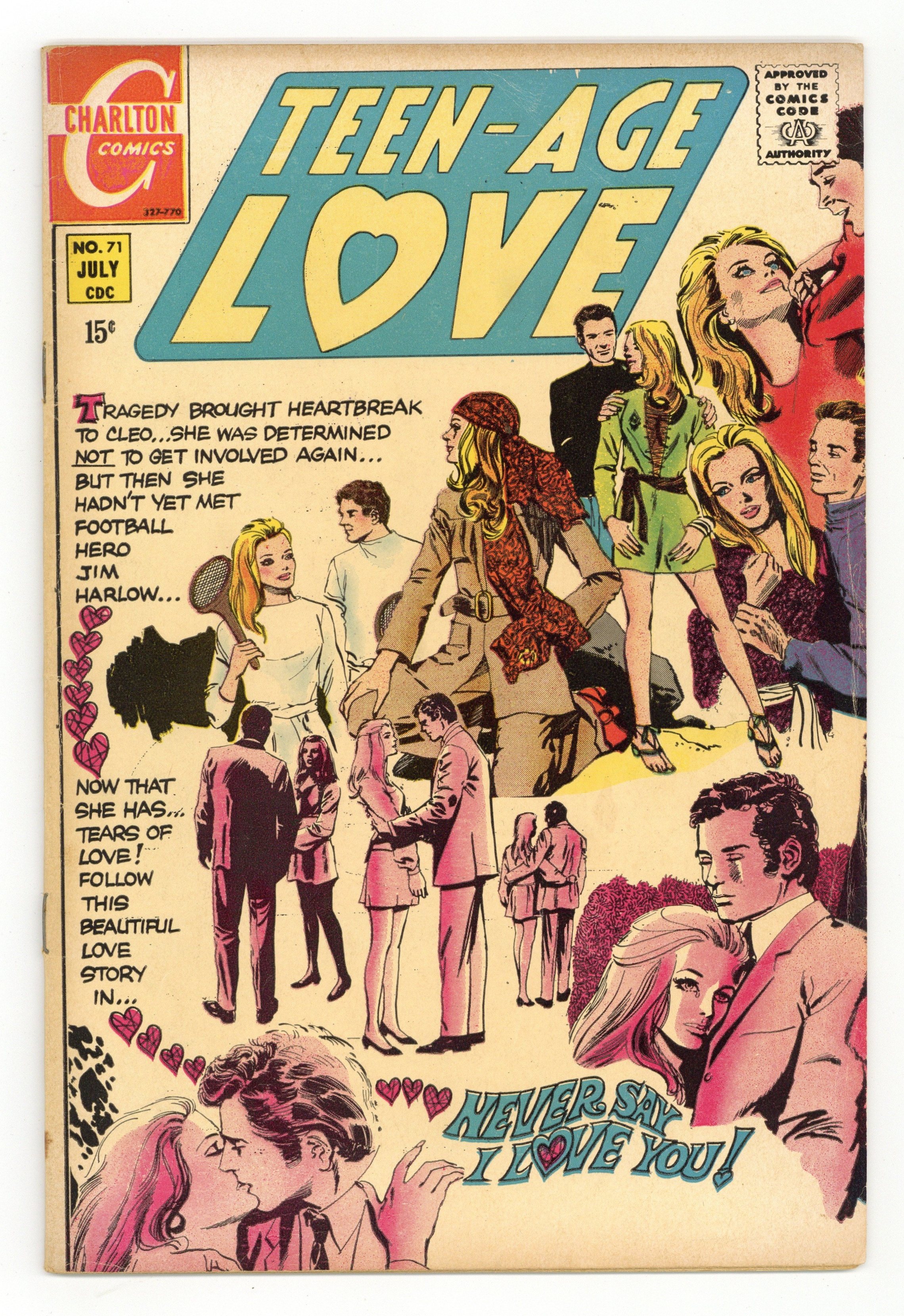 Published Jul 1970 by Charlton Comics Group.$8.00Charlton's long-running romance comic coincides with the blossoming of America's teen culture from the 1950s to the 1970s. Heartbroken after a tragedy, Cleo vows never to love again, but then she meets football player Jim. Charlton's romantic hippie hero, Jonnie Love, fixes Lila's car, but that just earns him the ire of Lila's boyfriend Tyler. Two Kinds of Kisses; Jonnie Love: Love Is Never Logical; Just Jeannette; Never Say I Love You. 32 pages, Full Color. Cover price $0.15.