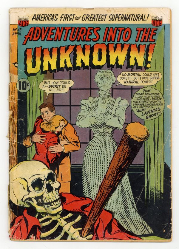 "Aunt Lavinia's Ghost" (art by Harry Lazarus), "Devil on Your Dial," "The Floating Coffin," and "The Firebird's Last Flight!" Edited by Richard E. Hughes. Cover by Ken Bald. Stories by Harry Lazarus, Dick Beck, George Klein, Lin Streeter, and Charles Quinlan. Spine-chilling tales of suspense, horror, and the supernatural—prepare yourself for Adventures into the Unknown! 36 pages, full color. $0.10. Cover price $0.10.