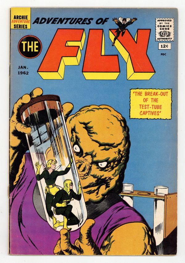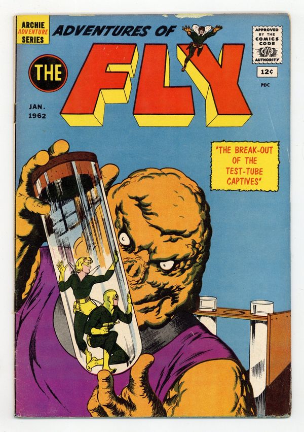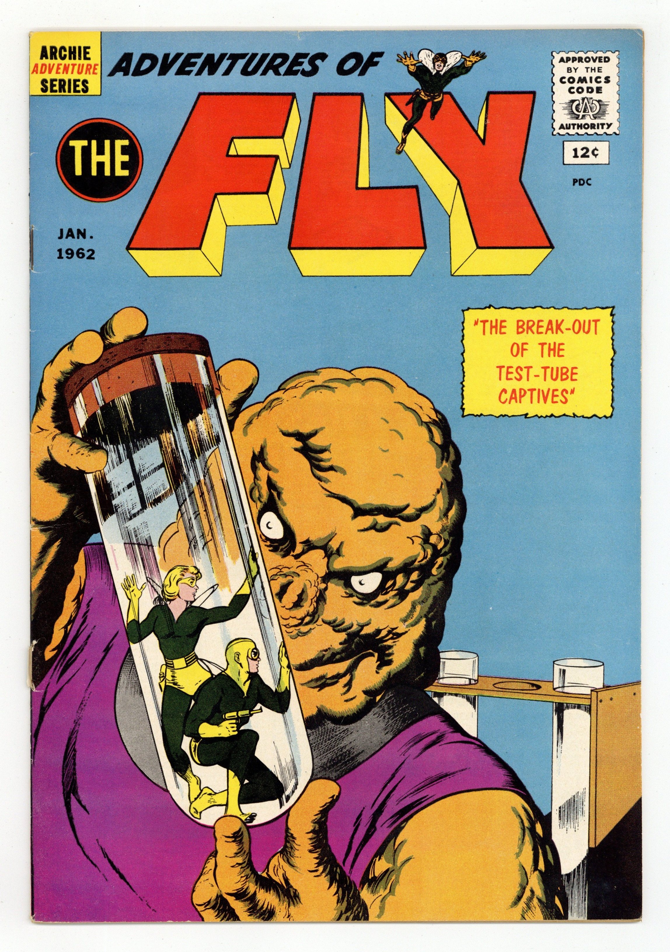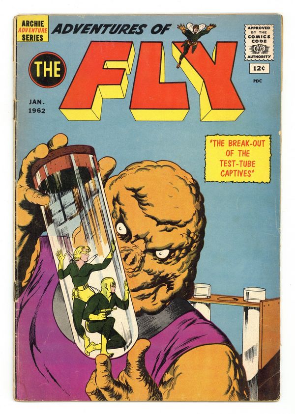 "The Menace of the Mythological Monsters," "The TestTube Flies," and "The Creature Who Invaded Capital City!" Edited by Victor Gorelick. Cover by John Rosenberger. Stories by Robert Bernstein and John Rosenberger. Archie Comics amiable and agile super-hero The Fly battles an assortment of nefarious villains, including the Mythological Monsters and Creature Who Invaded Capitol City. 36 pages, full color. $0.12. Cover price $0.10.