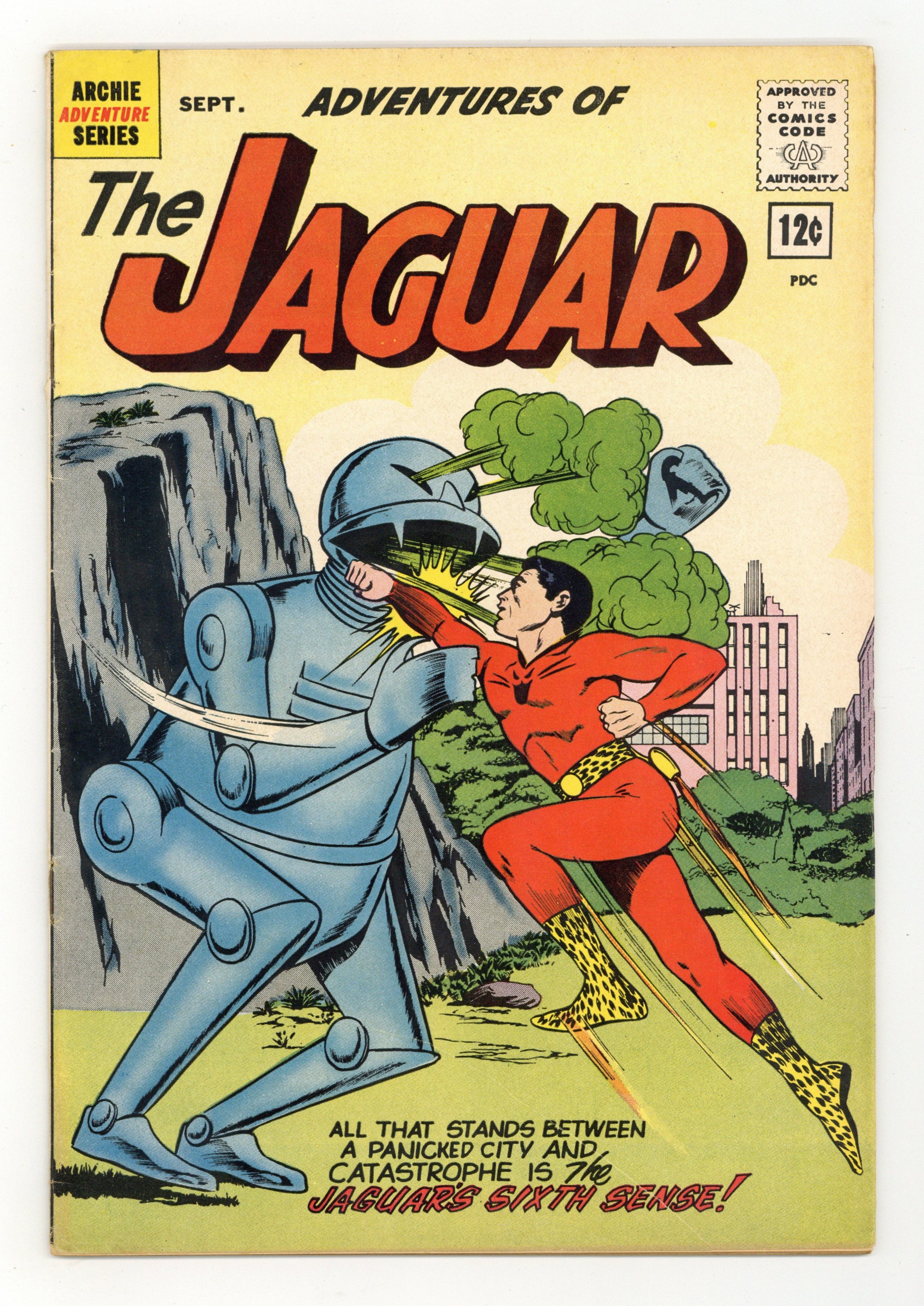 Published Sep 1962 by Archie Publications.$16.75Standard 12¢ cover priced edition. NOTE: A 15¢ cover priced test market edition was also released. Edited by Victor Gorelick. Stories by Robert Bernstein. Art and Cover by John Rosenberger. Super-hero adventure stories featuring The Jaguar! In this issue: All that stands between a panicked city and catastrophe is..."The Jaguar's Sixth Sense!"; "...A Day in the Life of Ralph Hardy!"; and "A Date with The Jaguar!" Characters in this issue: The Jaguar [Ralph Hardy]; Cat Girl [The Sphinx]; Jill Ross; Professor Kryle; Ramon. 32 pages, full color. Cover price $0.12.