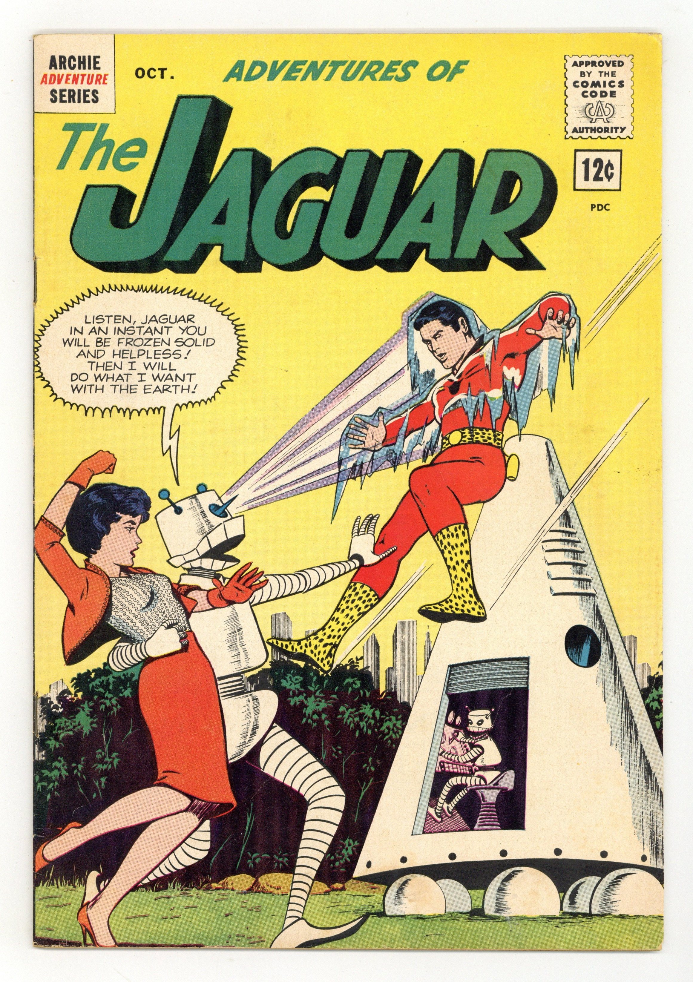 Published Oct 1962 by Archie Publications.$24.0012ยข cover price. Edited by Victor Gorelick. Stories by Robert Bernstein. Art and Cover by John Rosenberger. Super-hero adventure stories featuring The Jaguar! In this issue: "Time Out for Terror!"; "The Jaguar's Last Stand!"; and "The Lady Godiva of Elephants!" Characters in this issue: The Jaguar [Ralph Hardy]; Jill Ross; Cat Girl [The Sphinx]; Kree-Nal; Mineral-Man. 32 pages, full color. Cover price $0.12.