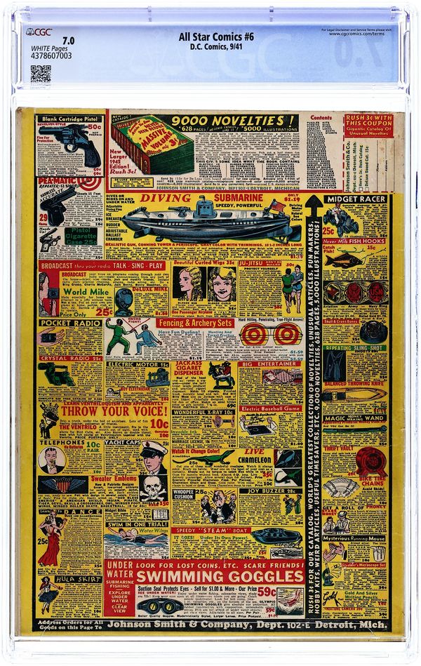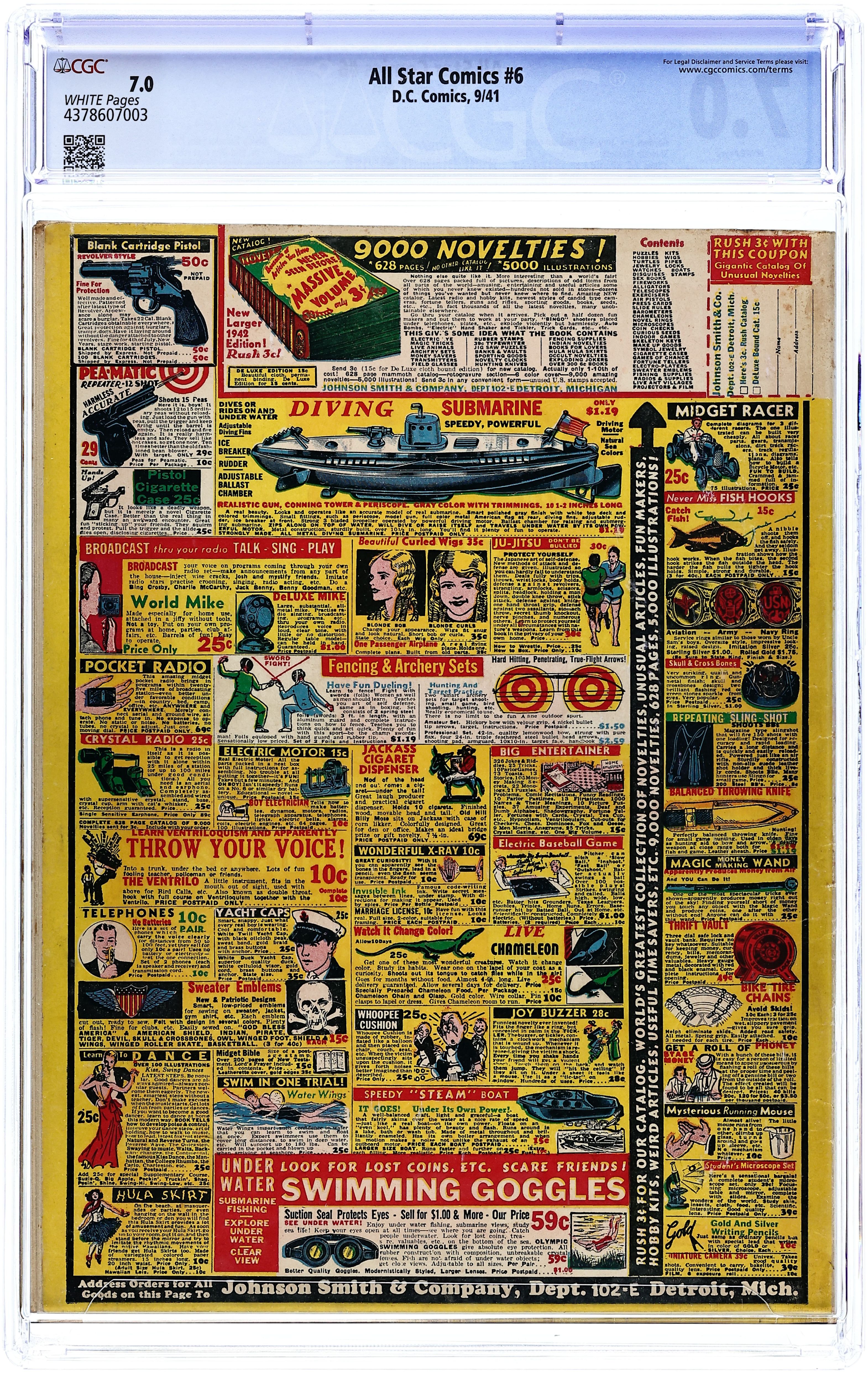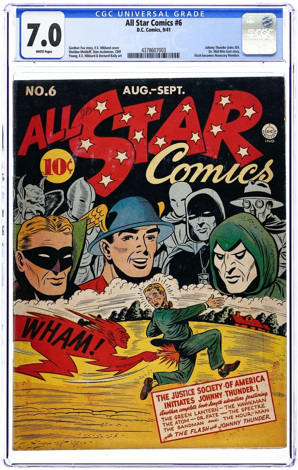"The Justice Society of America Initiates Johnny Thunder!" Flash becomes honorary member. Script by Gardner Fox. Individual chapters feature the Flash (art by Everett E. Hibbard), Johnny Thunder (art by Stan Aschmeier), Doctor Fate, the Sandman (art by Cliff Young), the Hour Man (art by Bernard Baily), the Atom (art by Ben Flinton), the Spectre (art by Baily), Green Lantern (art by Irwin Hasen), and Hawkman (art by Sheldon Moldoff). Two-page text story, "Dr. Mid-Nite Thinks Fast!" (script by Charles Reizenstein, art by Sheldon Mayer). Hibbard cover. 68 Pages, Full Color. Cover price $0.10.