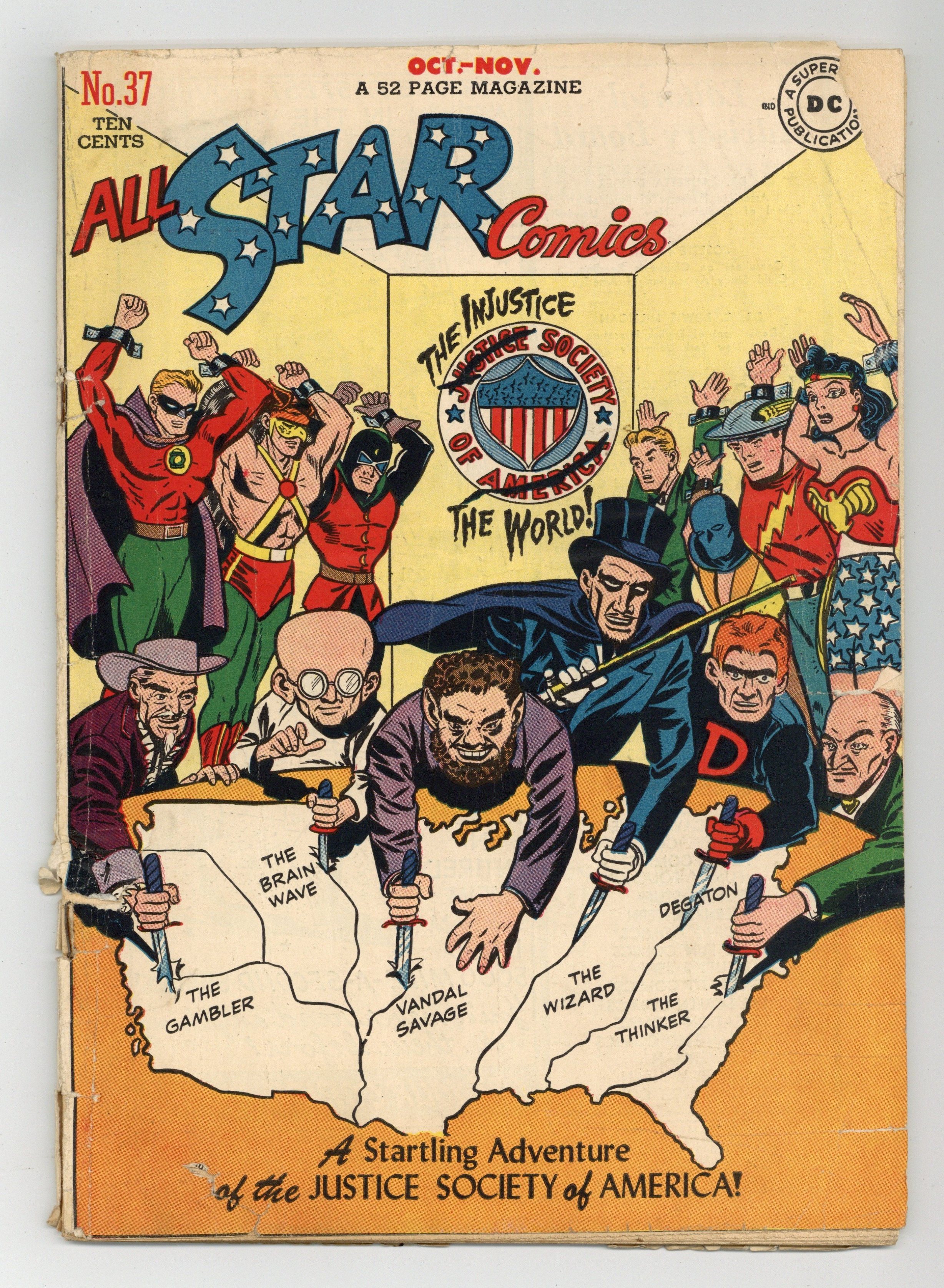 Origin and first appearance of the Injustice Society (the Wizzard, the Thinker, the Brain Wave, the Gambler, Vandal Savage, and Degaton). The roll call for the JSA this issue is Hawkman, the Flash, Green Lantern, the Atom, Dr. Mid-Nite, Johnny Thunder (cameo), and Wonder Woman. "The Injustice Gang of the World." Script by Robert Kanigher. Art by Irwin Hasen (part John Belfi inks) plus individual stories featuring Hawkman (art by Joe Kubert; last on this title), the Flash (pencils by Carmine Infantino, inks by Belfi), Green Langern (art by Hasen), the Atom (art by Alex Toth), and Dr. Mid-nite (art by Toth). Two-page text story, "Tick Tock" by Ted Udall. Hasen cover. 52 Pages, Full Color. Cover price $0.10.