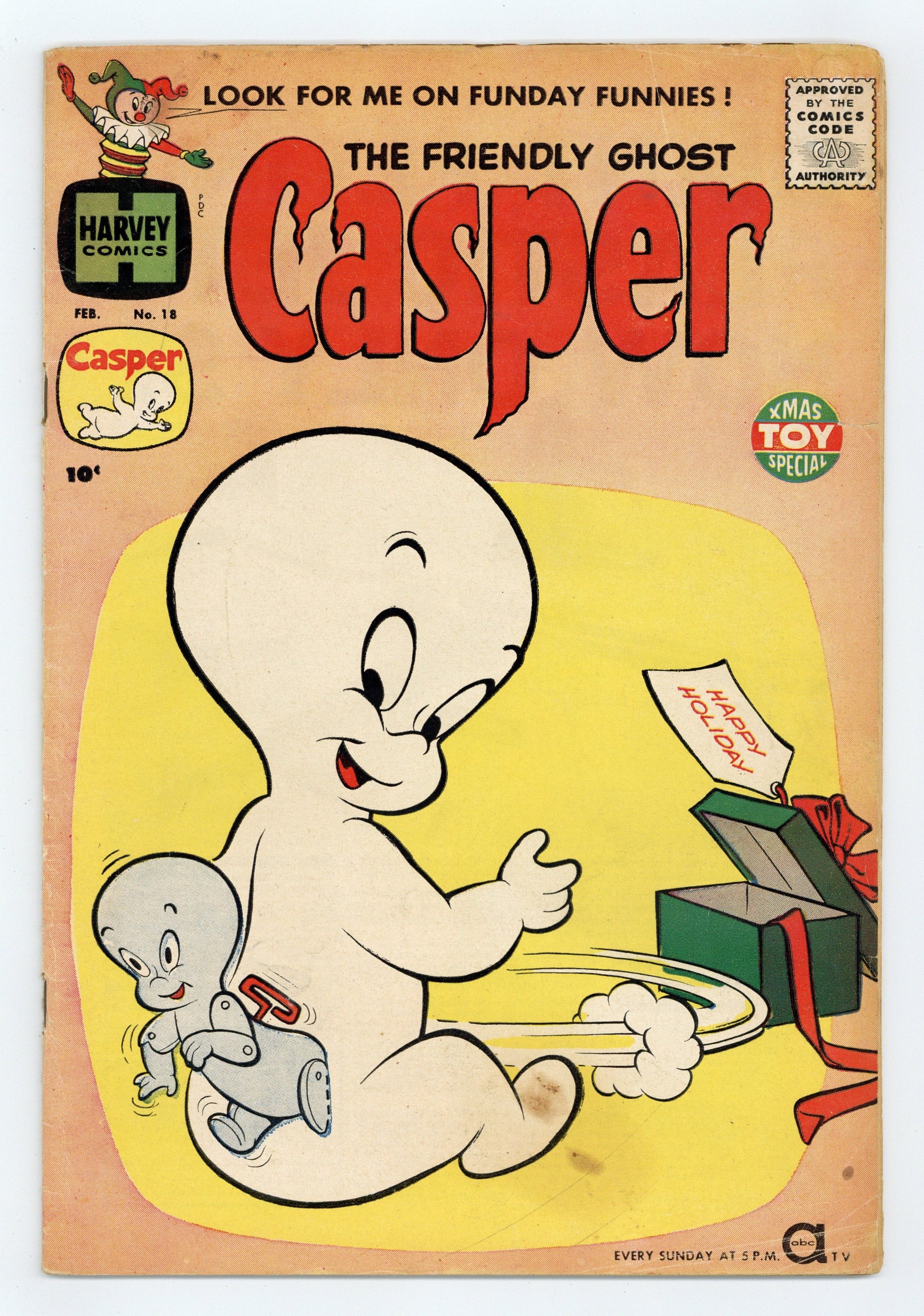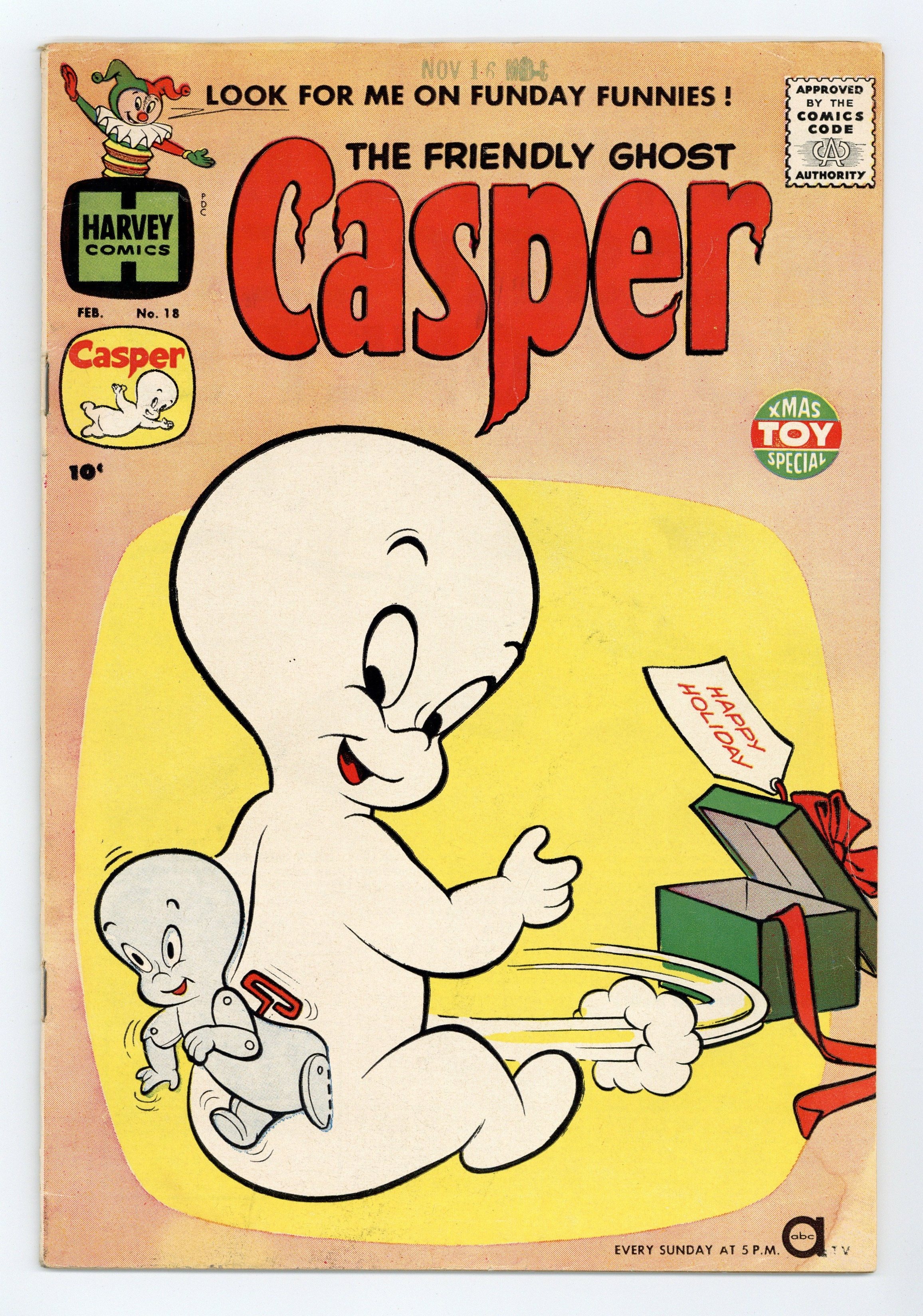 Cover by Warren Kremer. Harvey presents the adventures of Casper in the long-running series sometimes called The Friendly Ghost Casper. Casper brightens up an old painting from the inside. Plus vintage ads for Slinky, the Flexible Flyer, and Western TV show memorabilia. Casper the Friendly Ghost; Spooky. 36 pages, full color. Cover price $0.10.