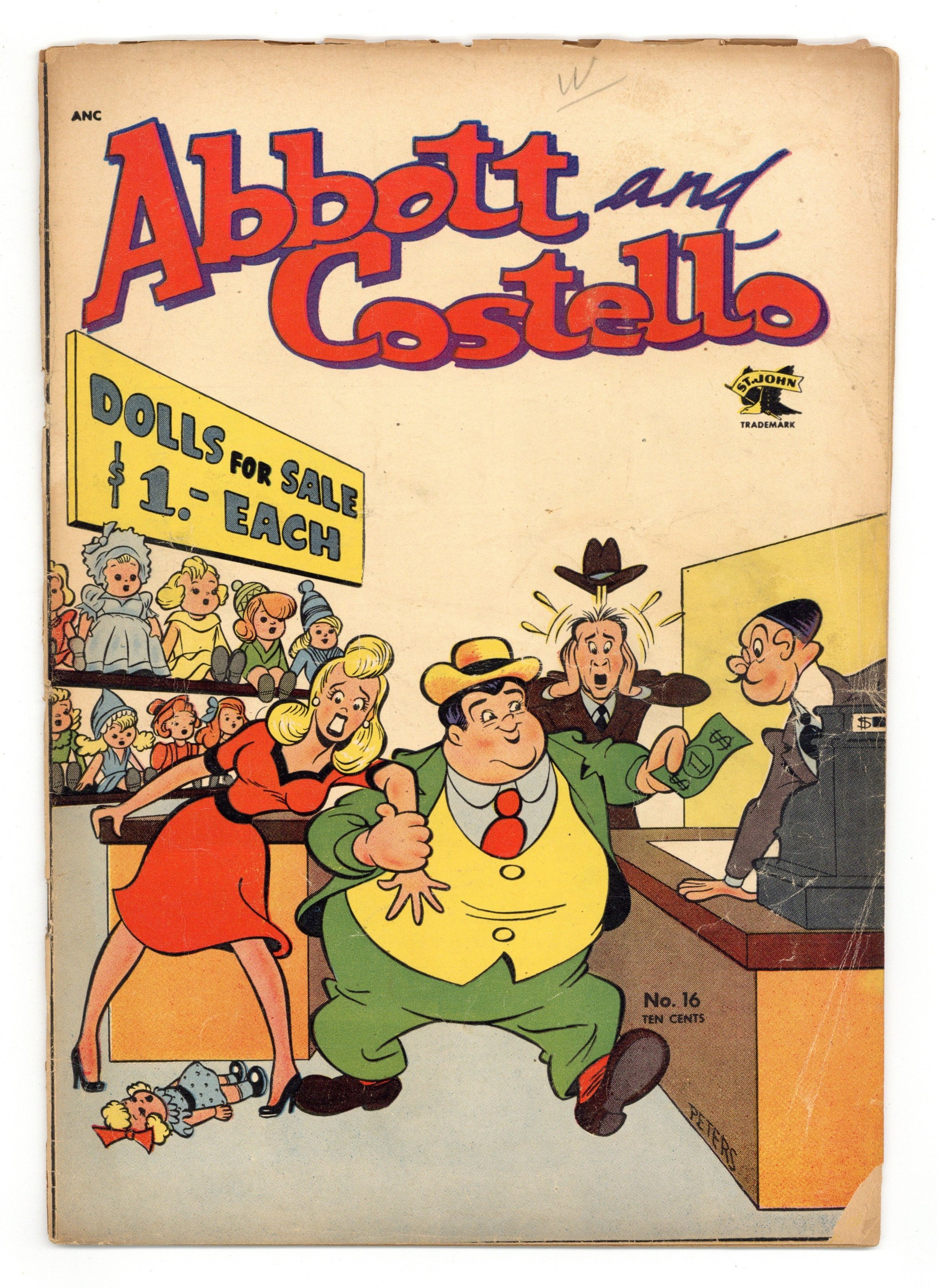 Cover by Eric Peters. The classic comedy duo of TV, radio and film starred in this comic at the height of their careers. Well-diggers Bud and Lou go looking for water with a divining rod and enter a house haunted by a sheet-ghost. Detectives Bud and Lou get mixed up with gangster Deadly Ernest and his henchmen Slug and Bullets. While working as aircraft mechanics, the boys accidentally become airborne. Water, Water, Everywhere; Too Many Dummies; Up in the Air; Double Take. 32 pages, Full Color. Cover price $0.10.