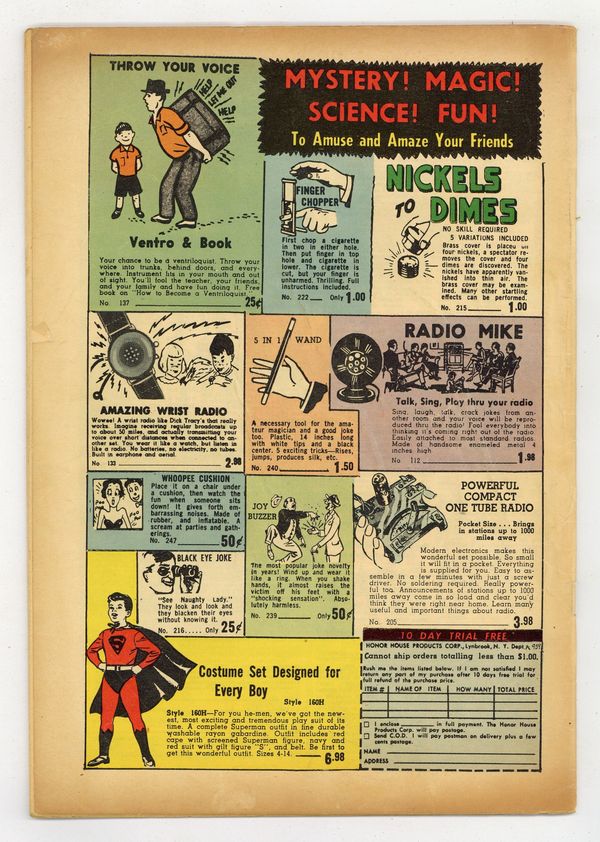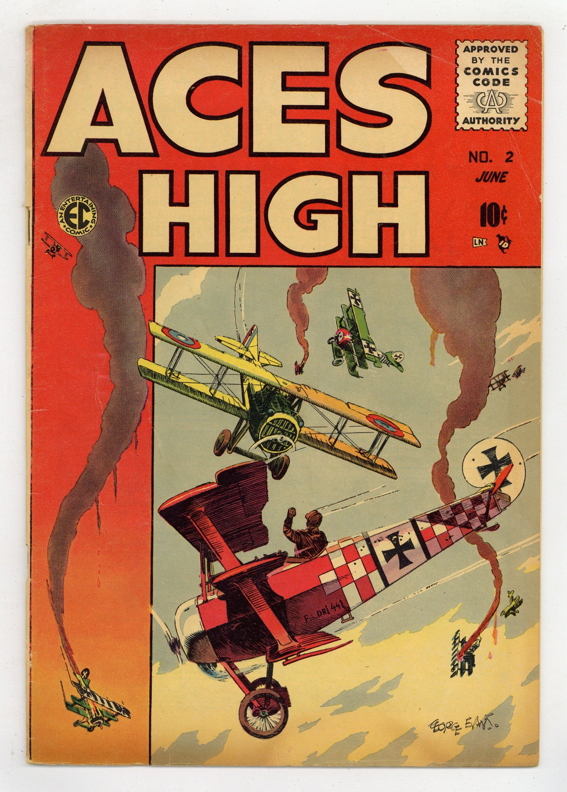 Cover by George Evans. Stories by Carl Wessler and others. Art by Bernie Krigstein, George Evans, Jack Davis, and Wally Wood. As part of its New Direction line, EC presents tales of air combat in World Wars I and II. WWI pilot Lt. Horst Viegel disregards the unwritten rules of conduct for air combat, and pays the price. Captain Warren vows revenge on the enemy ace who killed the nurse he loved during an air raid. A pilot is elated when he is finally accepted by the famed Lafayette Escadrille, until he learns the reason why a spot opened up. First issue with the Comics Code seal on the cover. Chivalry!; The Ace of Aces; Revenge; Locker 9; Laughing Warrior; Footnote. 32 pages, Full Color. Cover price $0.10.