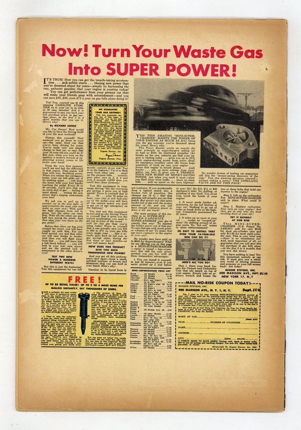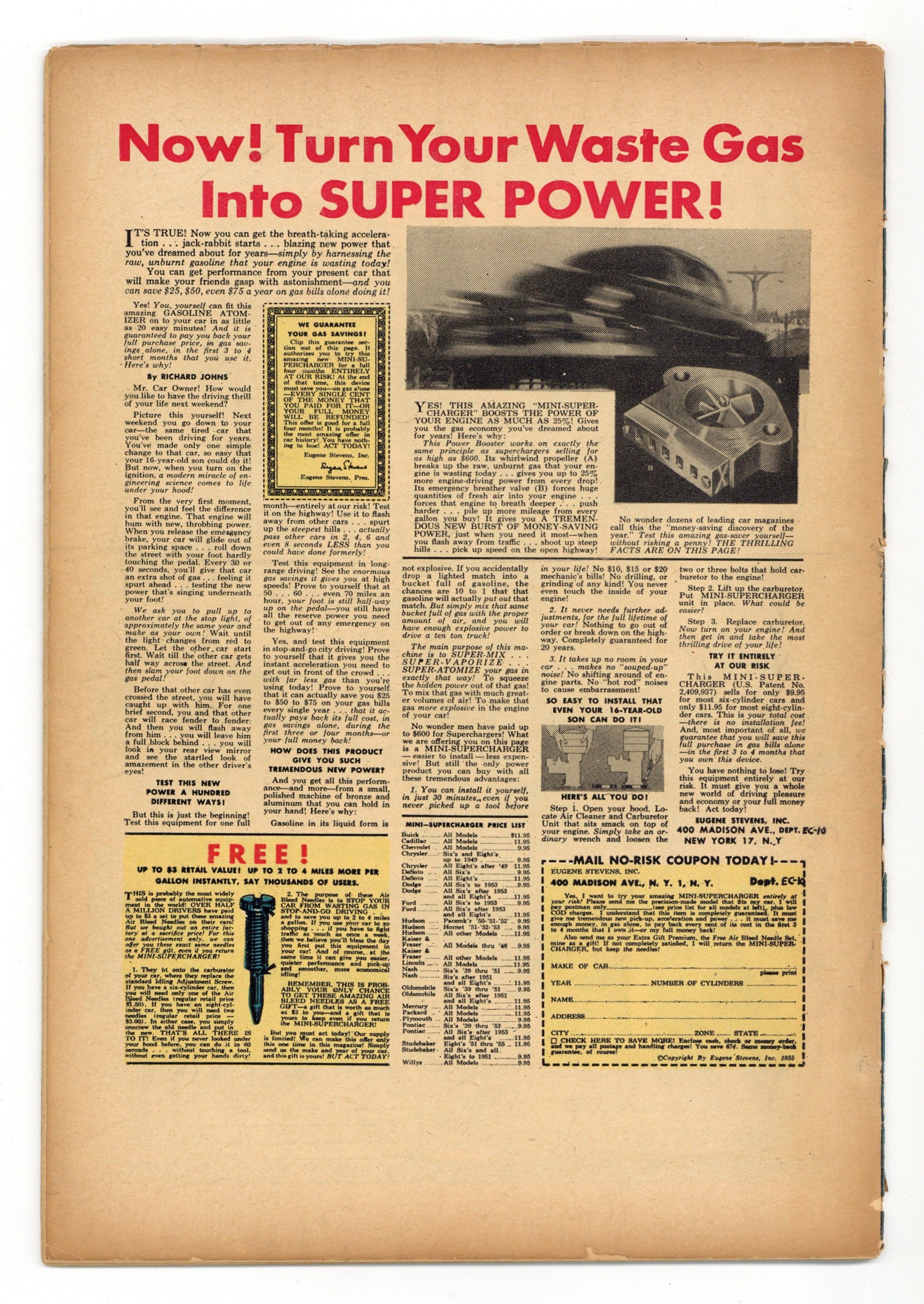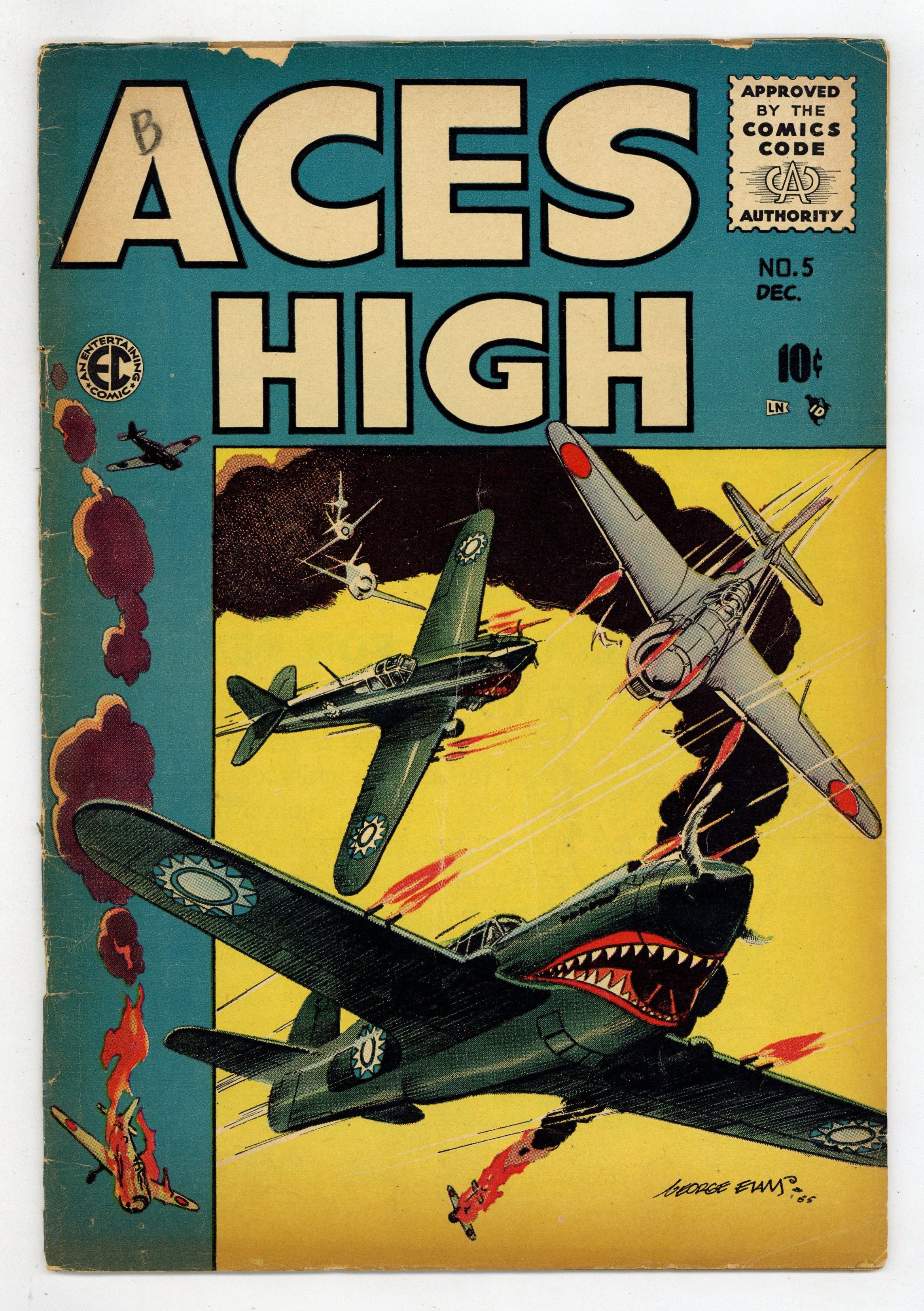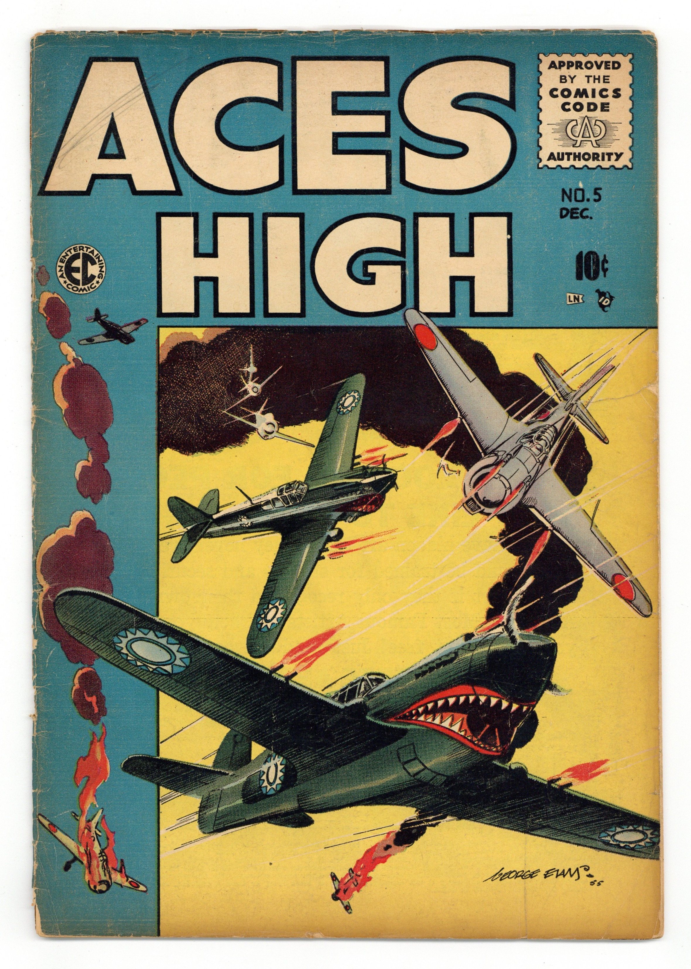 Cover art by George Evans. C'est La Guerre, art by George Evans; An American flight group roll dice to decide who will go on a suicide mission, and the French Captain cannot understand the Americans. Airman Unknown text story. Iron Man, art by Jack Davis; Fred Allison believes he can't be shot down. Spads Were Trump, script by Carl Wessler, art by Bernie Krigstein; Lt. Muller is the best ace in the group, but he seems to be afraid of the German ace named the Red Eagle. Ordeal, art by Wally Wood; Lieutenant Stoner, an experienced pilot, must do the one thing that scares him. 36 pgs. $0.10. Cover price $0.10.