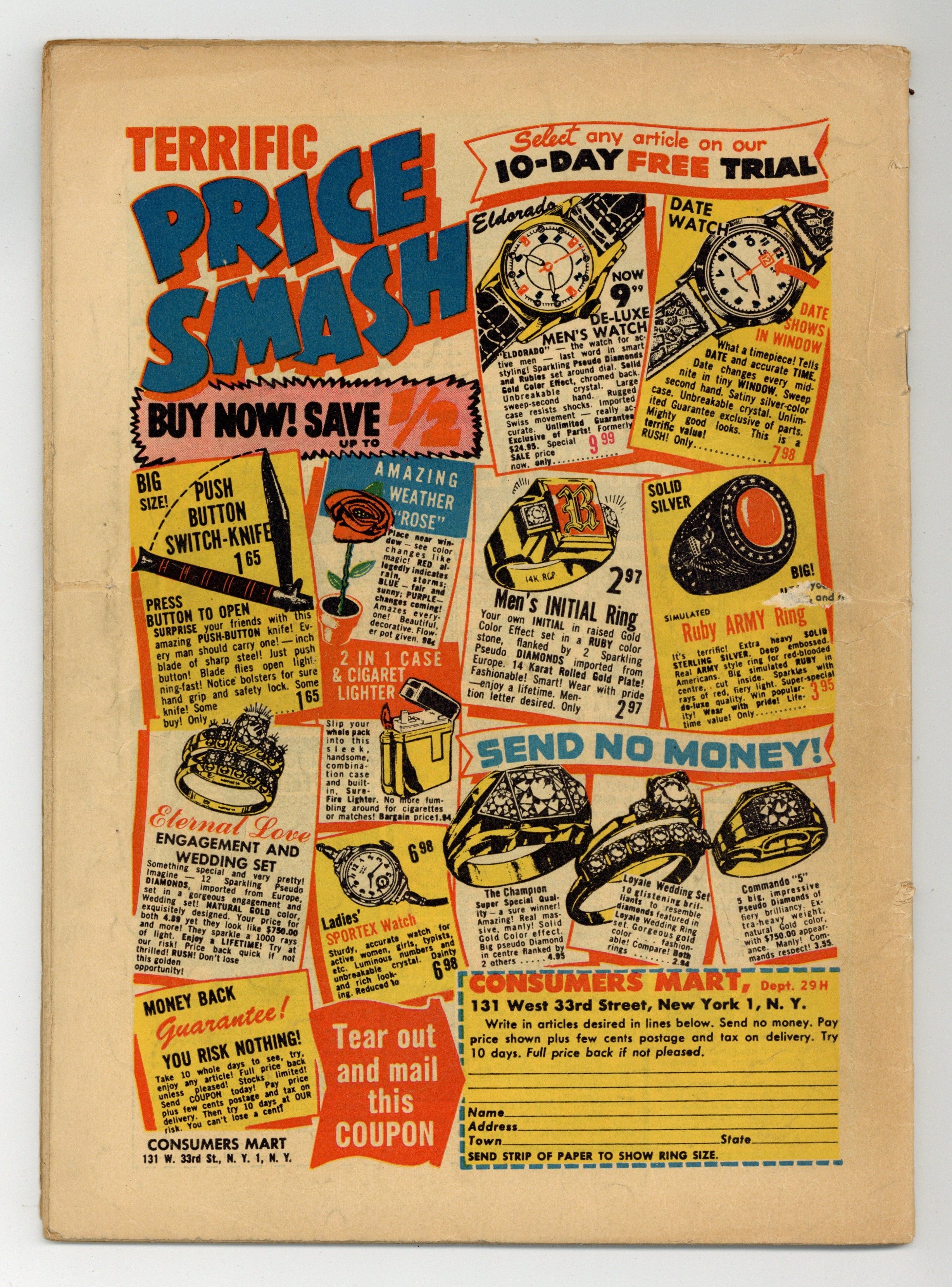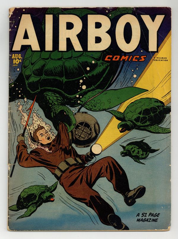 Cover by Ernest Schroeder. Stories and art by Arthur Peddy, Mike Becker and Ernest Schroeder. One of the more fanciful and influential of 1940s aviator heroes, Airboy fights evil with his radio-controlled plane "Birdie" and its plethora of experimental flying tech. Sometimes listed as Airboy Comics #90. No issue # on cover; Vol. 8, issue #7 in indicia. Airboy battles modern-day pirates who want the mysterious Golden Turtle and are willing to kill to get it. Strange vapors from a volcano transform a doctor into the Lava Man, who becomes a con man before facing The Heap. Peace-loving pilgrims en route to America must take up arms when a pirate ship attacks. Airboy; The Heap; The Great O'Dea; Pacific Touchdown; The Nester Fights Back; Captain Kidd, Jr.; Pilgrim Pirate. 48 pages, Full Color. Cover price $0.10.