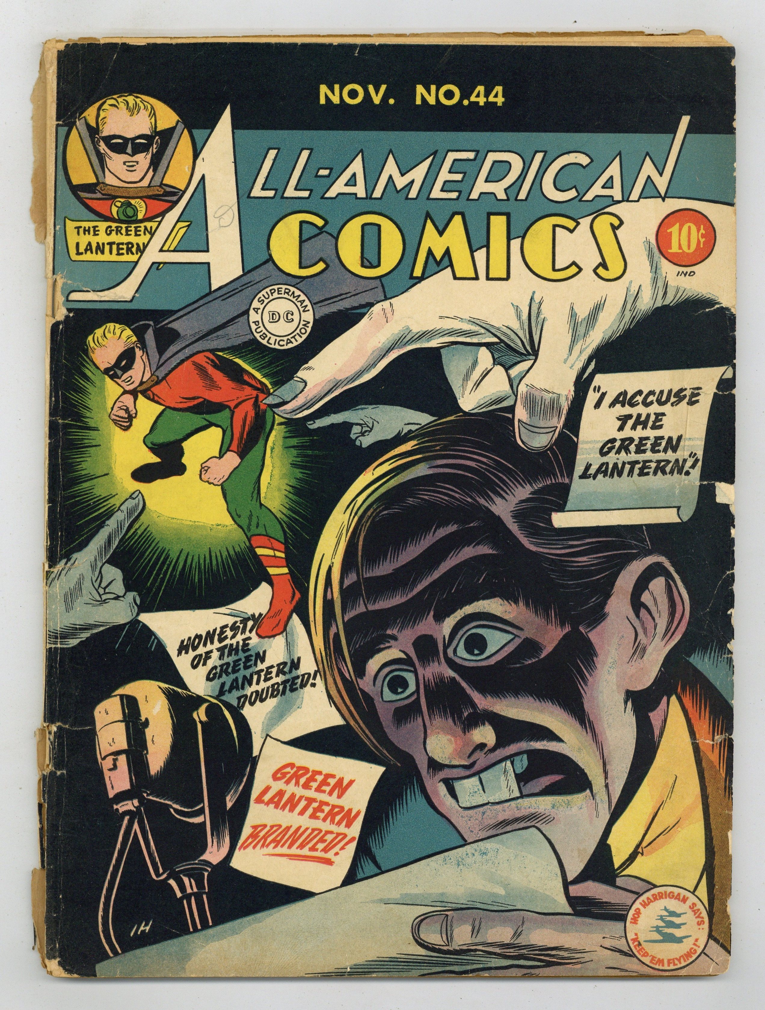 Cover art by Irwin Hasen. The Perfect Crime, script by Bill Finger, pencils by Irwin Hasen, inks by Harry Tschida; After Green Lantern is cauight red-handed at the scene of a crime, an APEX broadcaster begins a personal vendetta against the Emerald Crusader, charging him with being a master criminal! The Night Has a Thousand Eyes starring Dr. Mid-Nite, script by Charles Reizenstein, art by Stan Aschmeier. U.S. Savings Bonds public service announcement starring Green Lantern, art by Irwin Hasen. Gunnery Training Camp starring Hop Harrigan, script and art by Jon L. Blummer. The Missing Tycoons starring Sargon the Sorcerer, script by John B. Wentworth, art by Howard Purcell. Dinky Joins the Boy Scouts starring Scribbly and the Red Tornado, script and art by Sheldon Mayer. The Hungry Horse starring The Atom, script by Ted Udall, art by Joe Gallagher. Sabotage! starring Red, White and Blue, script by Ted Udal, art by Joe Gallagher. Mutt and Jeff strips by Al Smith (as Bud Fisher). 68 pgs. $0.10. Cover price $0.10.
