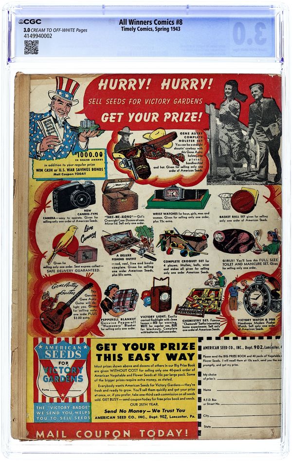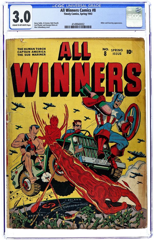 Cover art by Alex Schomburg. Invasion By Ice; Human Torch and Toro must stop the mad plans of a Nazi lunatic, who was released from an asylum, from assisting Hitler in a fantastic plan to invade England. The Plot To Kill MacArthur starring Captain America; A cruel Japanese warlord, thirsting for revenge for the shame thrust upon the 'honorable' ancestors of Nippon by the United States, devises a plan to kill General Douglas MacArthur in order to wipe out the memory of the Japanese defeat in the Pacific. Changes the Face of the Earth starring Submariner. To Hitler, From Hell starring The Destroyer. Ad urging readers to read Captain America Comics every month, and to join Cap's Sentinels of Liberty. Holdup! Robbery! Murder! starring The Whizzer, art by George Klein. 68 pages, full color. Cover price $0.10.