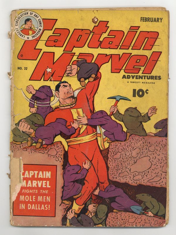 Cover by C.C. Beck. Stories by Otto Binder and unknown. Art by C.C. Beck and Pete Costanza. On Planetoid Punkus, Billy observes Mr. Mind's latest invention, a mammoth cannon called Great Big Bertha which is aimed at Earth and can fire shells that are a mile long. Billy escapes so that Captain Marvel can try to stop the cannon from being fired, but he is too late in "The Monster Society of Evil Chapter 11: The Firing of Great Big Bertha" by Otto Binder and C.C. Beck. Captain Marvel also stars in: "Deep in the Heart of Dallas" with art by C.C. Beck (appearances by Mayor Rodgers, Love Field, SMU, the Dallas Times Herald, the Dallas Morning News, and the Cotton Bowl); "The Military Misfit!" with art by C.C. Beck and Pete Costanza; and "The Glass-Blower of Greenpoint!" with art by C.C. Beck. Plus: 2-page text story "Name, Rank and Serial No." with script by Jess Benton. 60 Pages, Full Color. Cover price $0.10.