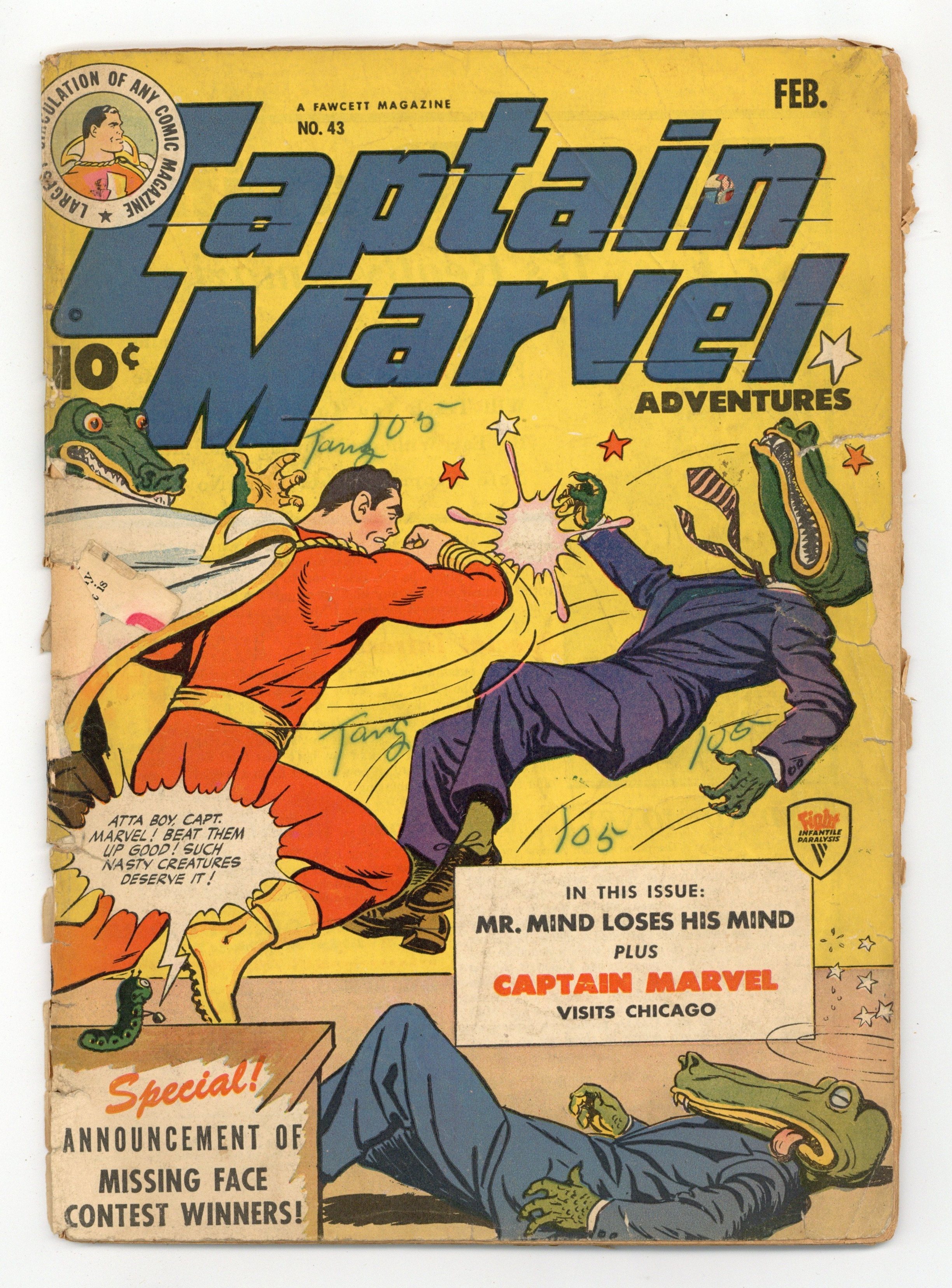 Cover by C.C. Beck. Stories by Otto Binder and unknown. Art by C.C. Beck, Pete Costanza, Al Liederman and unknown. Mr. Mind receives a blow on the head which causes him to forget his evil deeds. He wants to help Captain Marvel when his crocodile men try to crash a planetoid into Earth, but in the ensuing fight he is struck on the head again and reverts to villainy in "The Monster Society of Evil Chapter 22: Mr. Mind Loses His Mind" by Otto Binder and C.C. Beck. Plus: Uncle Marvel enlists Captain Marvel to help him save a carnival whose star performers have quit. Cap agrees with Mary Batson that he should pretend not to notice that Uncle Marvel has no powers, and helps cover for him in "Captain Marvel Meets Uncle Marvel" with story by Otto Binder. Captain Marvel also stars in "Captain Marvel Goes to Nowhere!" by Otto Binder, C.C. Beck and Pete Costanza, and "Captain Marvel Battles the Black Spot Gang of Chicago!" with story by Otto Binder (Chicago, IL city story). Plus: "Announcing! The Winners in Captain Marvel's Missing Face Contest!" 2-pager; Captain Kid in an untitled 1-pager with art by Al Liederman; and 2-page text story "Pepito and the Vaquero" by Arthur Lane. 52 Pages, Full Color. Cover price $0.10.