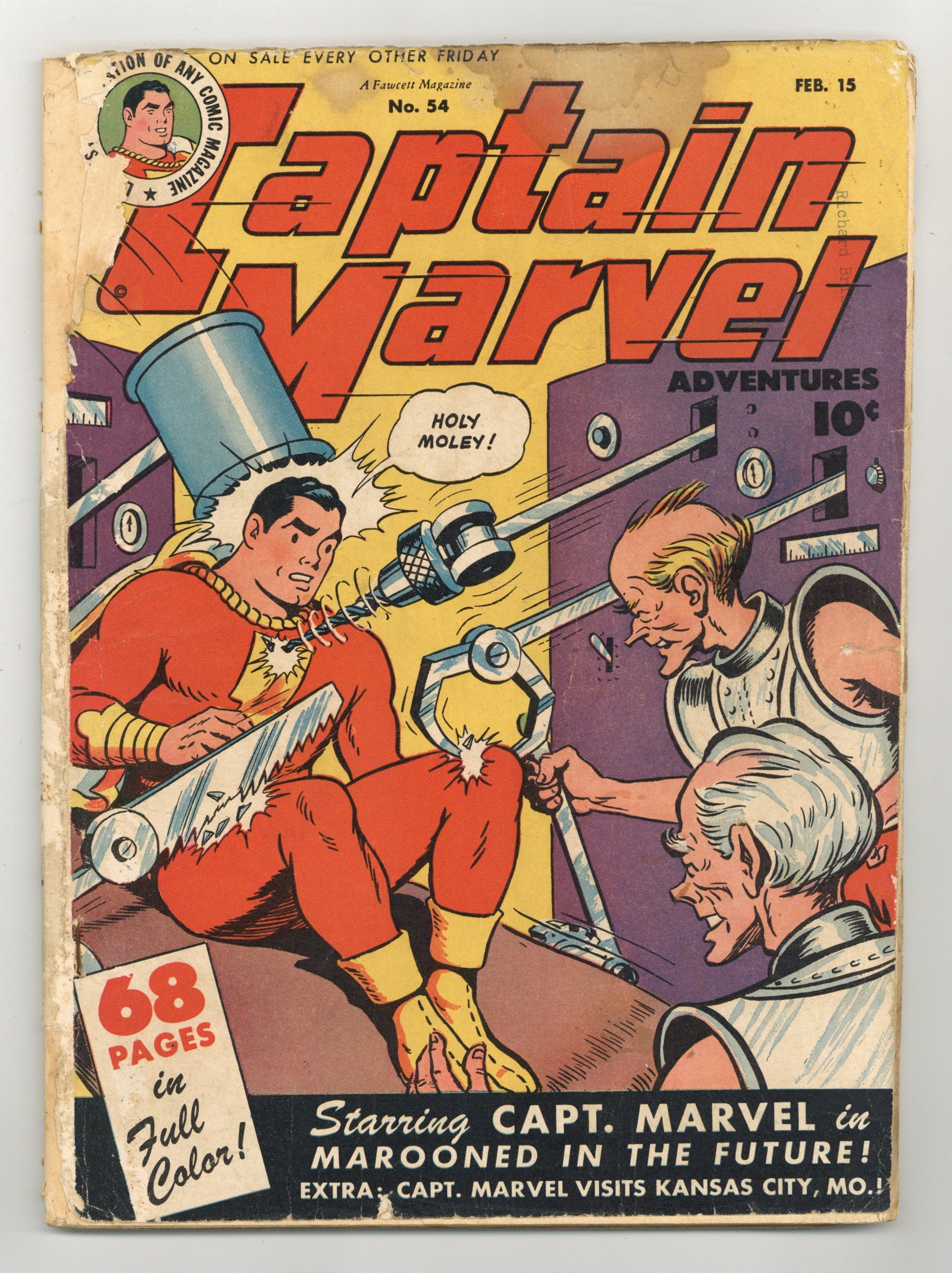 Cover by C.C. Beck and Pete Costanza. Stories by Otto Binder, Bill Woolfolk and unknown. Art by C.C. Beck and unknown. Captain Marvel (Billy Batson) stars in: "Sivana Plots Again" by Otto Binder and C.C. Beck; "The Country Slicker" with story by Otto Binder and pencils by C.C. Beck; "Marooned in the Future" by Otto Binder and C.C. Beck; "Station WHIZ Goes Television" by Bill Woolfolk and C.C. Beck; and "Captain Marvel Visits Kansas City, Missouri" with art by C.C. Beck. Plus: Captain Kid..."Takes a Flyer." And: 2-page text story "The Run-Around" by Justin Dewey Triem. 68 Pages, Full Color. Cover price $0.10.