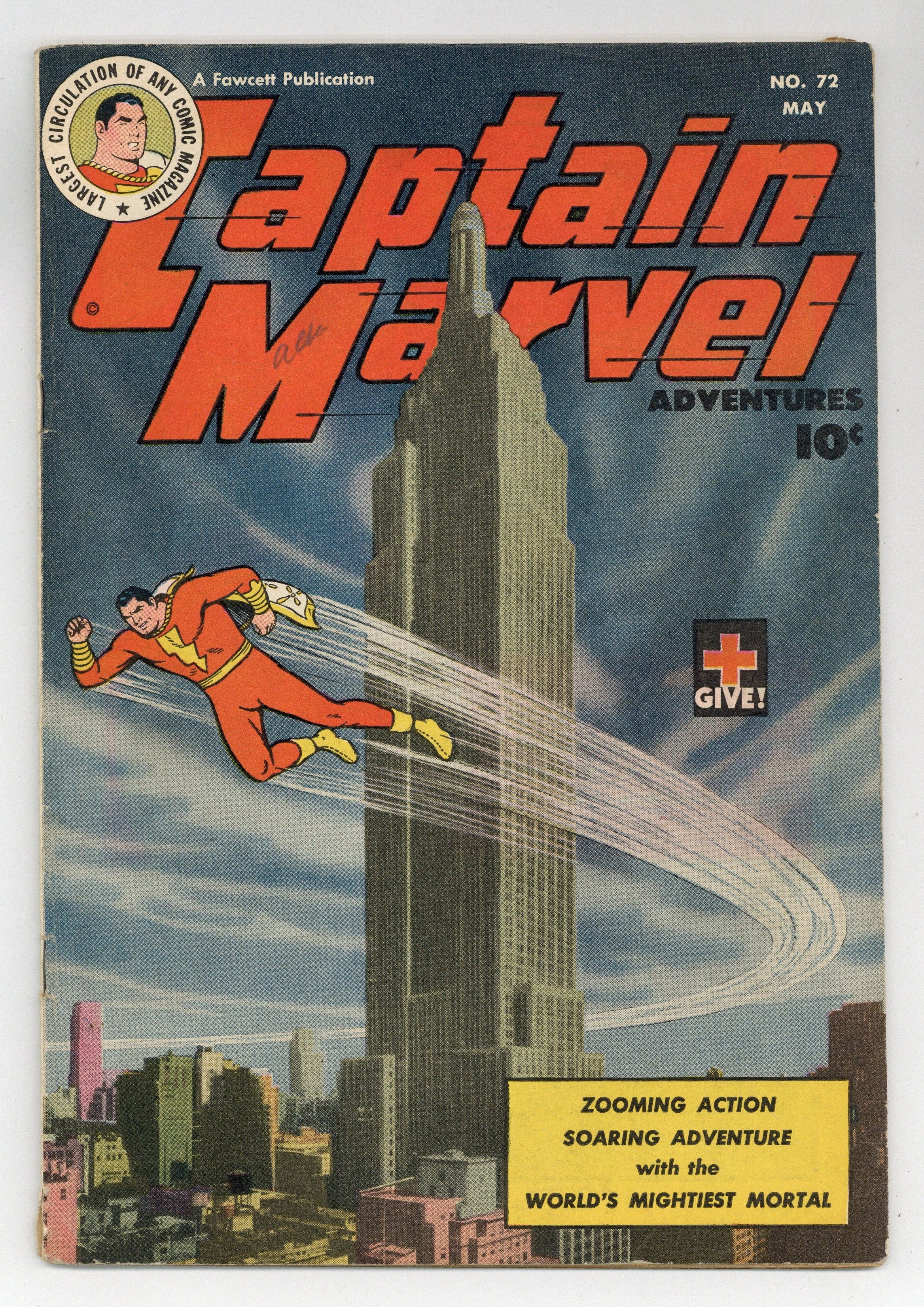 "Captain Marvel Judges the Dog Show," "Buried Alive," "Captain Marvel's Record," and "Captain Marvel Discovers a New Planet!" Back-up story: "Captain Kid Gets in Hot Water!" Two-page Jon Jarl text story, "The Dictator of Space" by Eando Binder. One-page Tootsie Roll ad, "Captain Tootsie and the Log Jam Rescue" by C.C. Beck and Pete Costanza. Part photo cover--Capt. Marvel flies through New York City. 52 Pages, Full Color. Cover price $0.10.