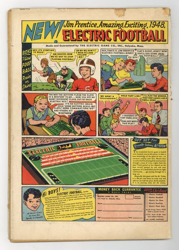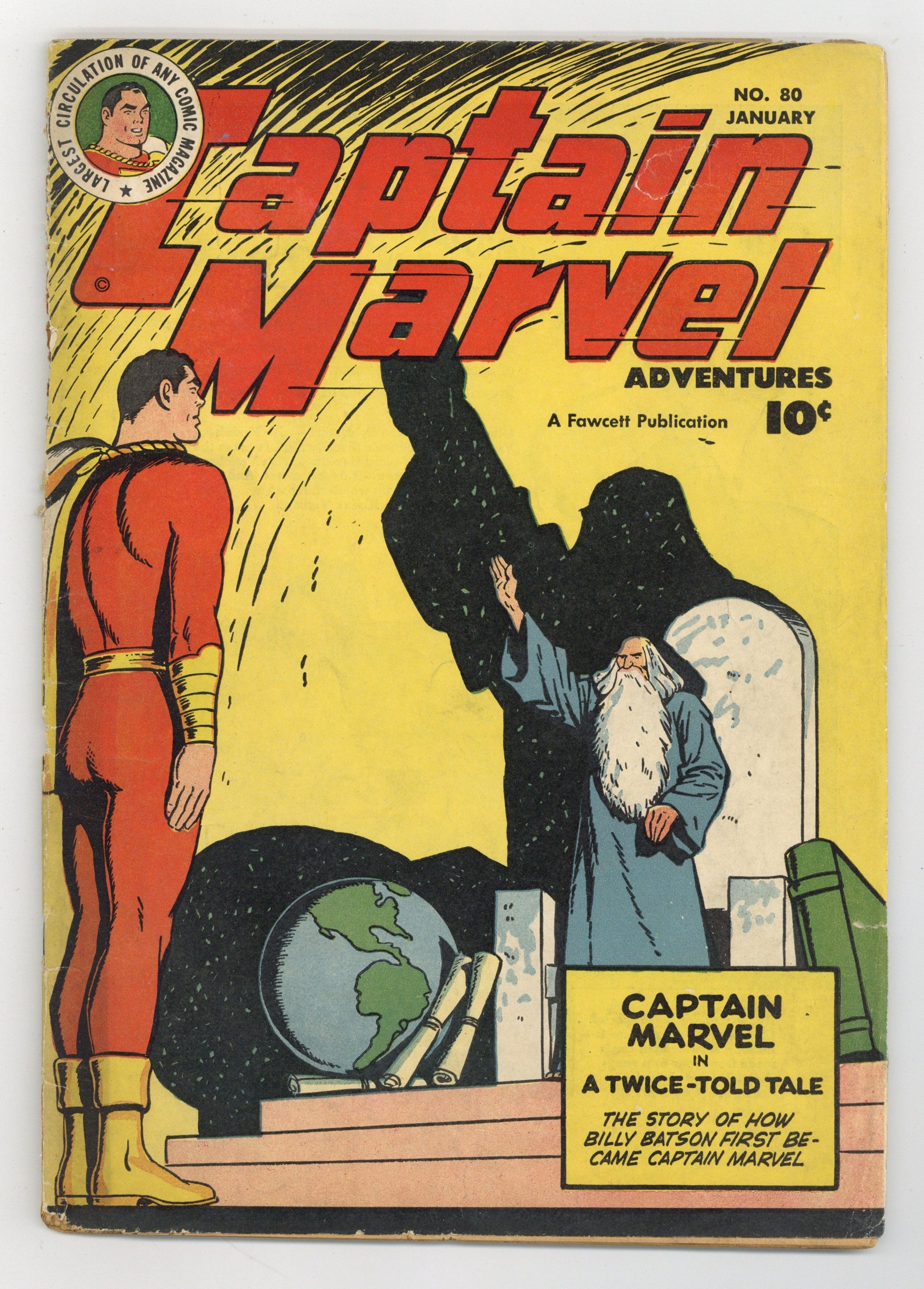 Cover by C.C. Beck. Stories by Otto Binder, Bill Woolfolk and Al Liederman. Art by C.C. Beck, Pete Costanza, Al Liederman and unknown. The story of how Billy Batson first became Captain Marvel in "A Twice-Told Tale" by Otto Binder, C.C. Beck and Pete Costanza (appearances by Shazam and Sivana). Plus: Captain Marvel and a surrealist artist visit the land from which the artist's paintings are derived in "Captain Marvel in the Land of Surrealism!" by Otto Binder and C.C. Beck. Also in this issue: "Captain Marvel's Inferiority Complex" and "Captain Marvel Meets the Weatherman," both written by Bill Woolfolk. Plus: Captain Kid..."On the Griddle" by Al Liederman. Also: Jon Jarl in the 2-page text story "Duel in Space" by Otto Binder (as Eando Binder). And: 1-page Tootsie Roll ad "Captain Tootsie Saves the School Party" with art by C.C. Beck and Pete Costanza. 52 Pages, Full Color. Cover price $0.10.
