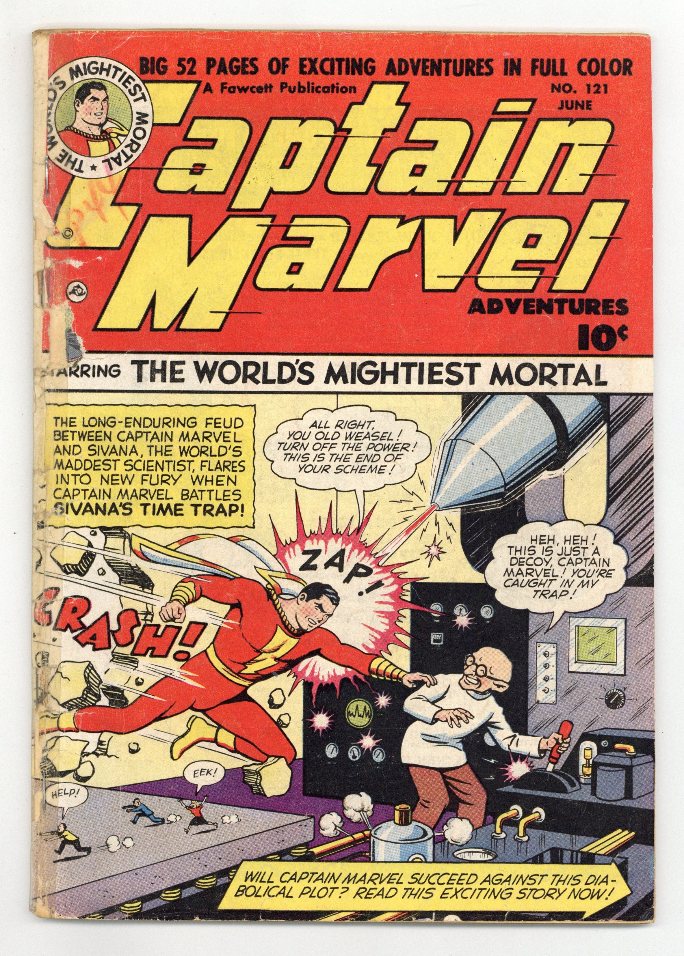 Cover pencils by C.C. Beck. Stories by Otto Binder and unknown. Art by Pete Costanza, C.C. Beck and unknown. The long-enduring feud between Captain Marvel (Billy Batson) and Sivana, the world's maddest scientist, flares into new fury when Captain Marvel battles Sivana's Time Trap! Will Captain Marvel succeed against this diabolical plot? Find out in "Captain Marvel and Sivana's Time Trap" by Otto Binder and Pete Costanza. Also in this issue: "Captain Marvel Fights the Perilous Key" by Otto Binder and C.C. Beck; "Captain Marvel Battle the Mysterious Glass-Fogger" with story by Otto Binder; and "Captain Marvel and Mr. Tawny's Diet Dangers" by Otto Binder and C.C. Beck. Plus: Captain Kid in "Captain Kid and the Adventuresome Hike"! And: Jon Jarl in the 2-page text story "Dimension Danger" with script by Otto Binder (as Eando Binder). 52 Pages, Full Color. Cover price $0.10.