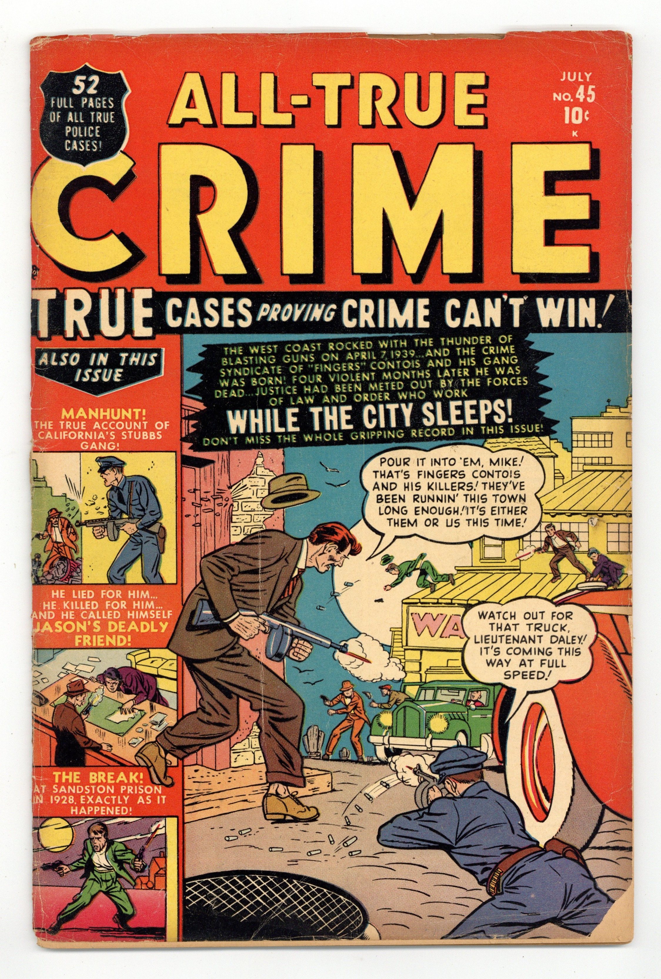 Written by Carl Wessler, Hank Chapman and unknown. Art by Jon D'Agostino, Robert Q. Sale, Dan Loprino, Ann Brewster, Jack Keller, Chic Stone and unknown. True cases proving crime can't win! The West Coast rocked with the thunder of blasting guns, and the crime syndicate of "Fingers" Contois and his gang was born! Four violent months later he was dead. Justice had been meted out by the forces of law and order who work..."While the City Sleeps"! Don't miss the whole gripping record, with art by Robert Q. Sale. Also in this issue: "The Break" at Sandston Prison in 1928, exactly as it happened, with story by Carl Wessler and pencils by Jon D'Agostino; 2-page text story "The Corpse With No Face"; "In the Line of Duty" with art by Dan Loprino; the true account of California's Stubbs Gang in "Manhunt" by Wessler and Ann Brewster; he lied for him...he killed for him...and he called himself..."Jason's Deadly Friend" by Wessler and Jack Keller; "Hit and Run" with art by Chic Stone; and "The Fence" with story by Hank Chapman. 48 pages, full color. Cover price $0.10.