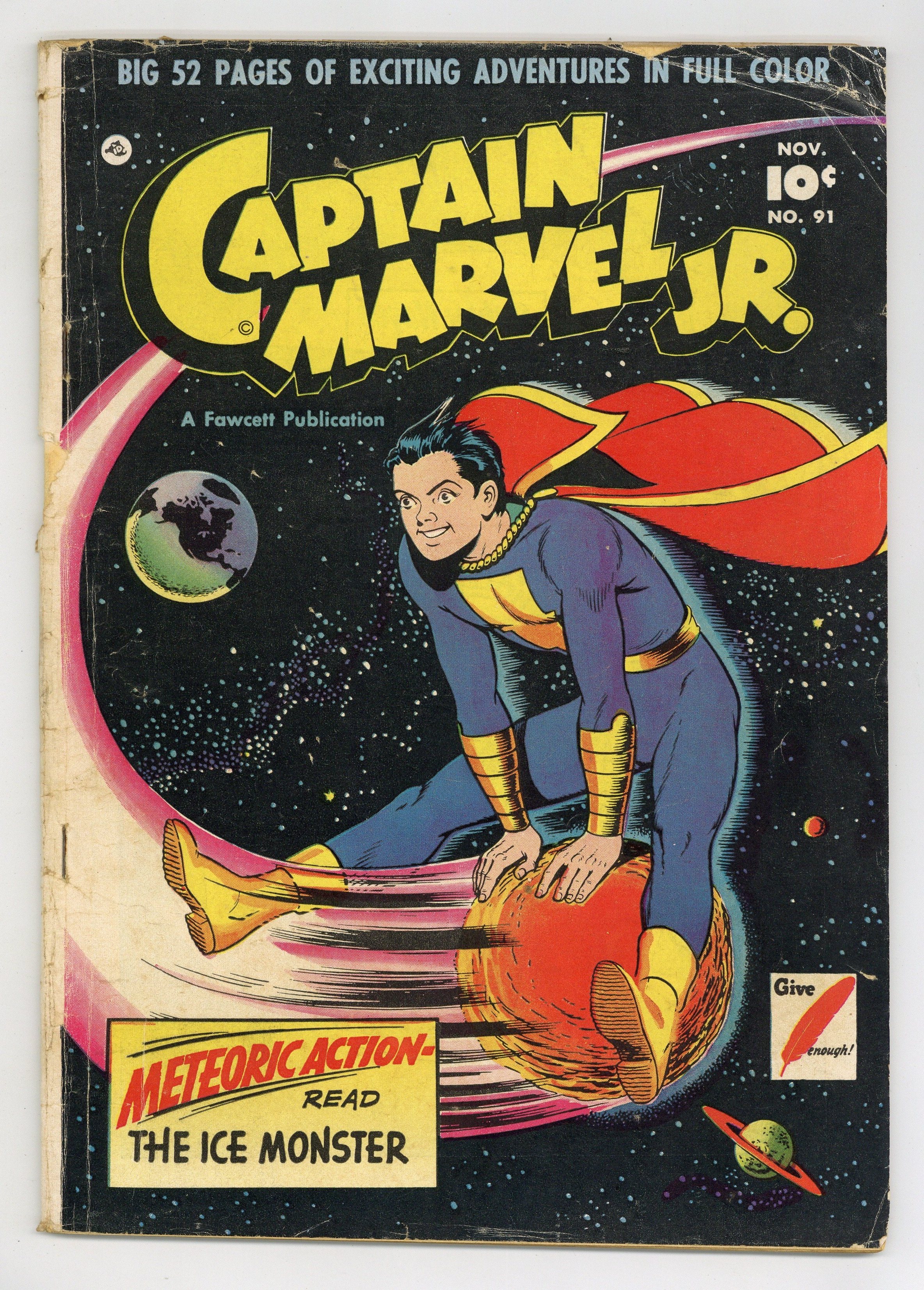 $100.00Cover by Kurt Schaffenberger. Stories by Bill Woolfolk, Howard Boughner, George Marko and Art Helfant. Art by Art Helfant, George Marko, Howard Boughner and Joe Certa. Superhero action with Freddy Freeman, who gains the same powers as his hero Captain Marvel, better known these days as Shazam. An expedition to the lands beneath the Antarctic ice cap unearths a living creature the approximate size and shape of Fin Fang Foom - and it's angry. The strange new resident at Mrs. Wagner's boardinghouse is murdered, and Freddy Freeman must figure out which of his fellow boarders is the killer. Fish mutated by nuclear waste become voraciously hungry and capable of eating any substance, so Captain Marvel Jr. and a cadre of fisherman must catch them before they devour the world. The Giant Ice Monster; Judge Smudge; Rubbernose Randolph; Kanvasback: Fore!; Just Another Suicide; The Murder at Mrs. Wagner's; Sivana, Jr.'s Green Fog; Boxcar Benny; The World Eaters; Dopey Danny Dee. 48 pages, Full Color. Cover price $0.10.